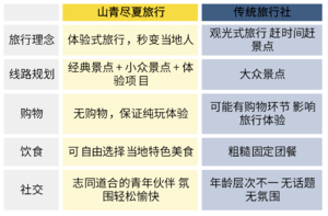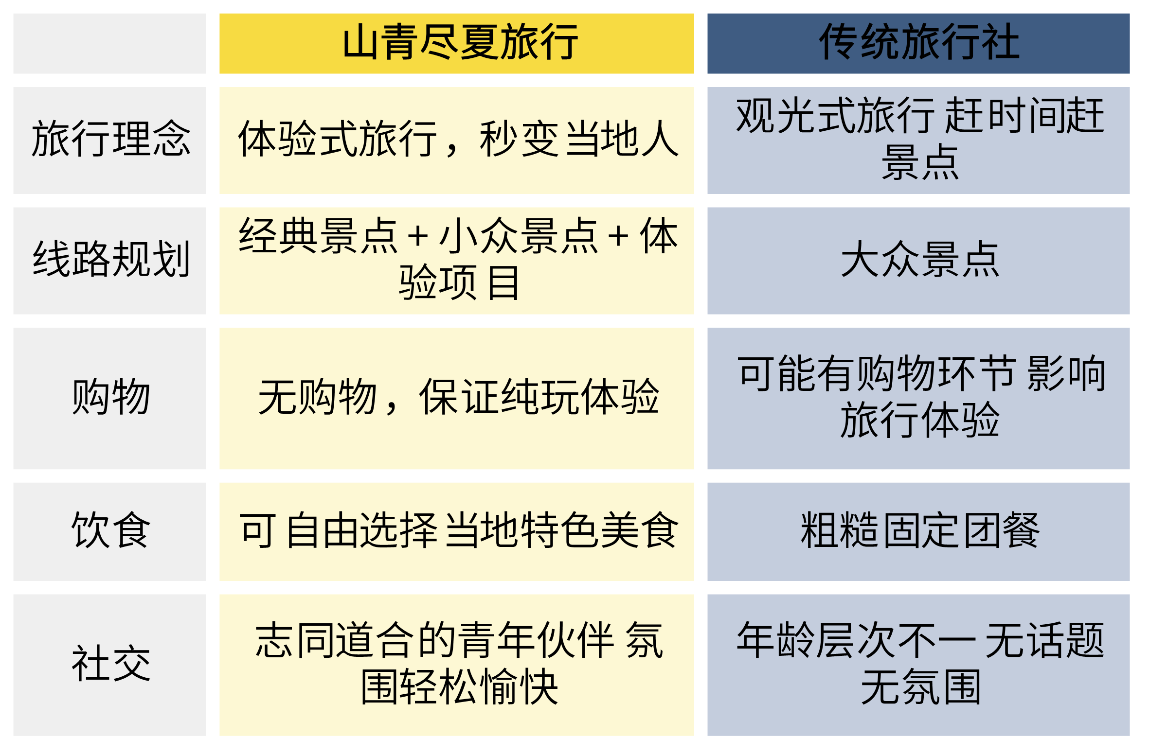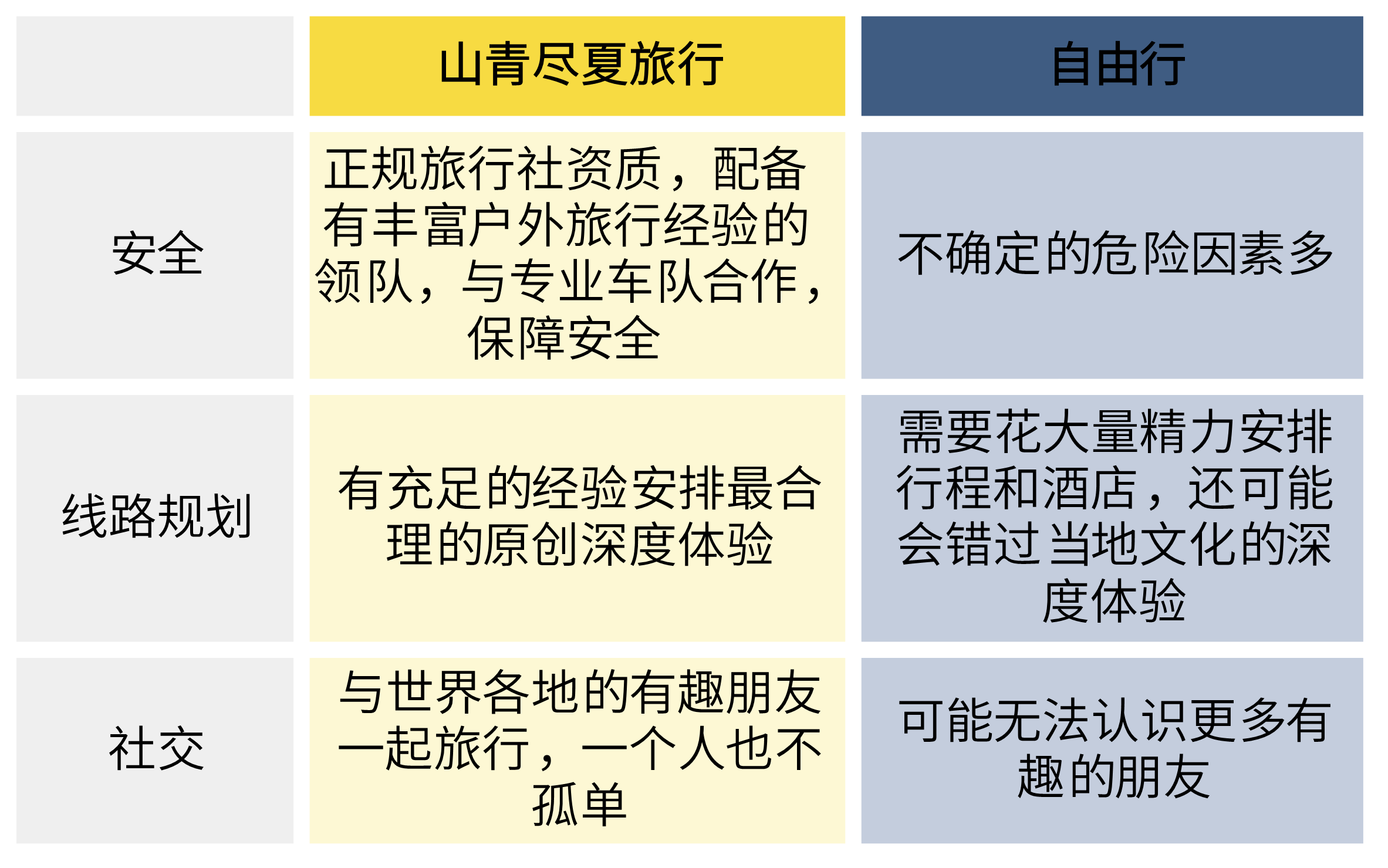 山青尽夏是以用户为核心,以目的地为承载的场景化社交旅行品牌,致力于年轻人深度体验式旅行,提倡以有领队的自由行、轻探险式户外交友旅行体验为核心的旅行理念,打造年轻人自己的青年营地。