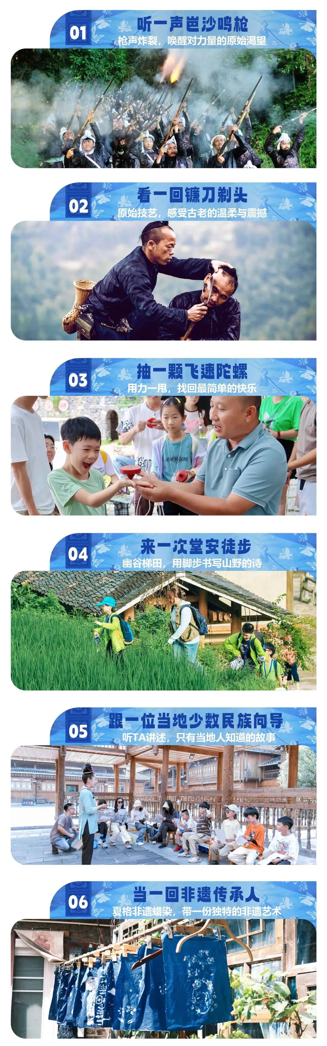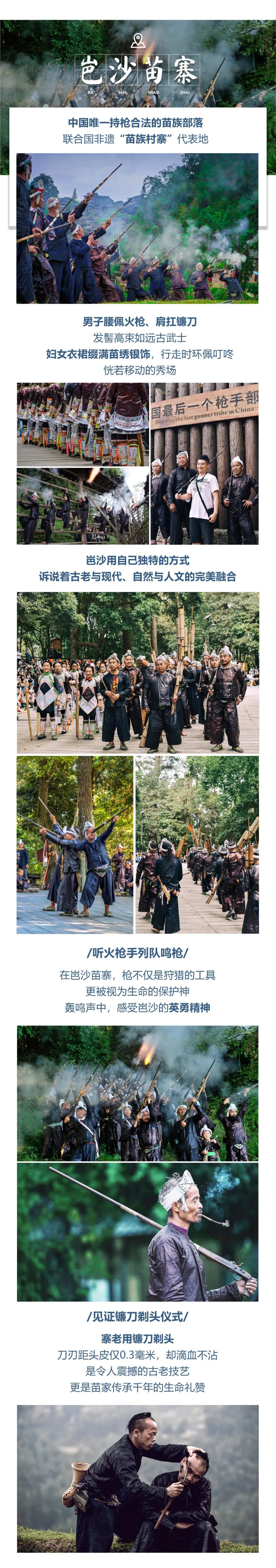 早餐后我们前往“中国最后一个持枪部落”【岜沙苗寨】在这里生活的人们因为政府允许可终身配枪,我们会在这个被称为“单身者胜地”的地方去了解苗族与侗族的结合,近距离观看岜沙汉子的彪悍与纯朴,来自大山深度的持枪部落,通过当地观看村民表演的【镰刀剃头】和【鸣枪表演】更近一步了解这个把时光凝固住的村寨。