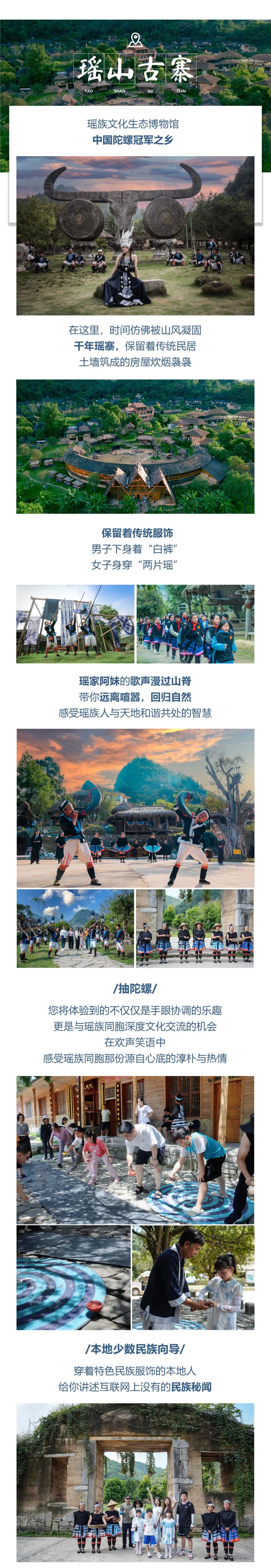 走过这三道门,便踏入了这神秘的古寨。我们将在这里体验【非遗竞技一抽陀螺]同时也在这里体验不一样的一顿当地特色宴席瑶王喜宴,观看一场当地的少数民族特色表演回到酒店。