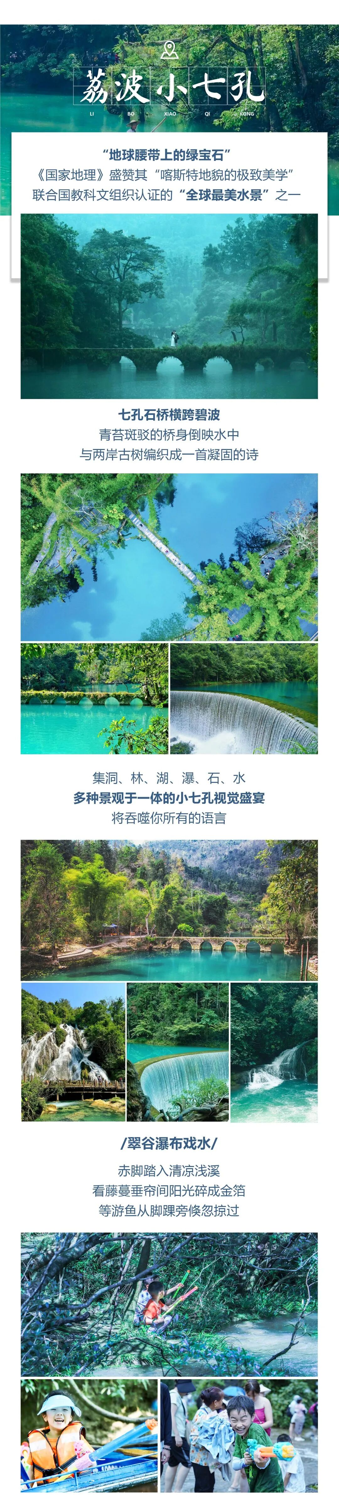 早餐后,我们出发前往【荔波小七孔】,荔波位于贵州与广西的交界处,小七孔更是被称为地球上的绿宝石,我们从东门进入小七孔景区,穿过清朝时期修建的小七孔桥,步行于这“抬头张家界,低头九寨沟”的自然风光,步行于走道上,水花溅落在四周,感受【68级跌水瀑布】和【拉雅瀑布】的壮观,我们戏水踏步于“水上有石,石上有树,树植水中”的【水上森林】,归隐于卧龙潭瀑布。