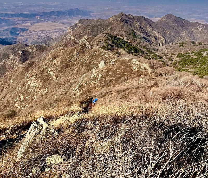 本线路难度中等,全程都为成熟户外线路,痕迹较为清晰,一半登山道一半小道。此山为军都山主要山峰之一,海拔1278米,山体呈北东向延伸,东北与十八盘岭、风驼梁一脉相连,西南与八达岭隔川相对,并与三山共同突起于延庆盆地东南侧。爬上山顶,眼前一片开阔,妫川盆地的山丘、河流、道路、村庄历历在目。