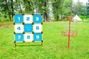 将九宫格和飞盘的玩法相结合,考验的是扔盘人的准确度。在3米之外使用飞盘将九宫格中的板块击落,每人可投掷3个盘,累计得分高者胜。