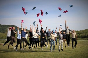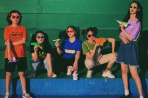 一排站齐,抬一条腿,相邻的小伙伴手互相交叉,表情管理到位。