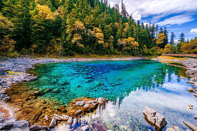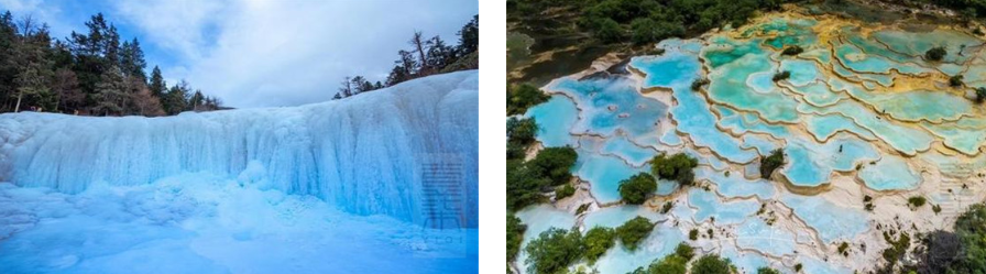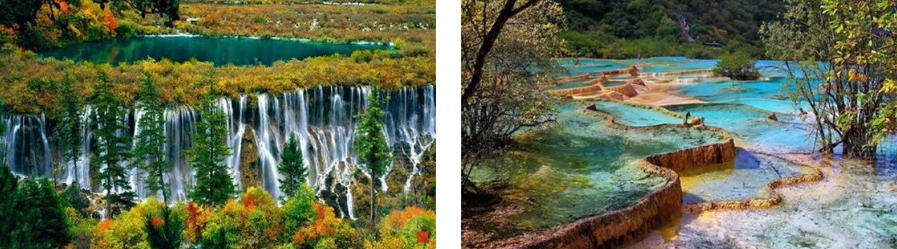 九寨沟:世界自然遗产、国家重点风景名胜区、国家AAAAA级旅游景区、国家级自然保护区、国家地质公园、世界生物圈保护区网络,是中国第一个以保护自然风景为主要目的的自然保护区。九寨沟位于四川省阿坝藏族羌族自治州九寨沟县境内。地处青藏高原、川西高原、山地向四川盆地过渡地带,南距成都市300多公里,是一条纵深50余千米的山沟谷地,总面积64297公顷,森林覆盖率超过80%。因沟内有树正寨、荷叶寨、则查洼寨等九个藏族村寨坐落在这片高山湖泊群中而得名。九寨沟国家级自然保护区主要保护对象是以大熊猫、金丝猴等珍稀动物及其自然生态环境。有74种国家保护珍稀植物,有18种国家保护动物,还有丰富的古生物化石、古冰川地貌。“九寨归来不看水”,是对九寨沟景色真实的诠释。泉、瀑、河、滩108个海子,构成一个个五彩斑斓的瑶池玉盆。长海、剑岩、诺日朗、树正、扎如、黑海六大景观,呈“Y”字形分布。翠海、叠瀑、彩林、雪峰、藏情、蓝冰,被称为“六绝”。神奇的九寨,被世人誉为“童话世界”,号称“水景之王”