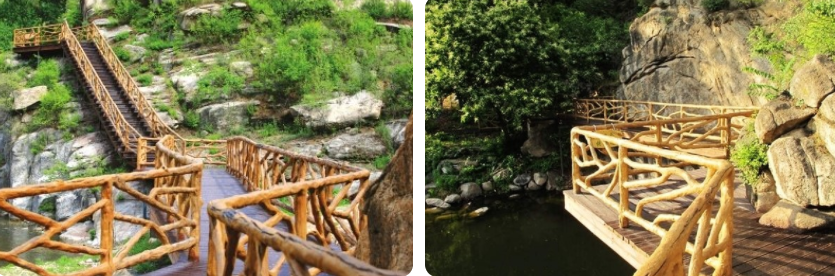 栈道总长度7000米,是华北地区最长的山水栈道,专为APEC会议而投巨资修建的,如今却已人迹罕至。栈道起于不夜谷内,延绵至神堂峪景区清舍雅苑---篱笆书屋建成于2011年,占地170多平米,书屋由木料建成,外观铺满了柴禾棍,阳光透过柴禾棍的缝隙,洒满整个书屋,单层的篱苑书屋完全融入了周围的自然环境中
