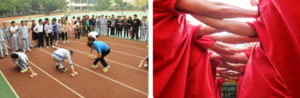 三人位一个小组,两人扮演大树将手拉起来,一人蹲下扮演松鼠。教练有三个口令“刮风了”“下雨了”“地震了”,学员根据口令做出相应的判断,动作最迟缓的学员将受到惩罚