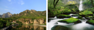 景区内翠绿的檀林,蜿蜒的千年古藤遍布整个峡谷,蜿蜒小道曲折而上,潺潺小溪足下流淌,颇具诗意。奇特的“三叠瀑布”落差115米,自女儿泉急流直下,水雾随风飘落,如银河般挂在峭壁上