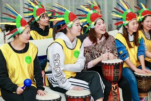 1:介绍非洲鼓的背景及意义后,选酋长、王妃、歌姬、吉祥物;起部落名字;画部落图腾;为每位队员着非洲装、化面部图腾