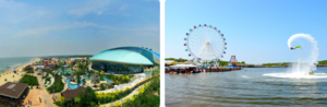 渔岛景区划分为五大区域:"多彩观光区、激情表演区、动感娱乐区、海滨浴场区、温泉度假区",乘船入岛,沙雕观赏,滑沙滑草、滑草冲浪(渔岛的滑草冲浪没有大海的涨潮落潮限制,随时都可以滑。),激情四射的大型梦幻水寨和环水寨漂流河;坐上摩天轮鸟瞰渔岛全景,左有紫色薰衣草,右有碧海金沙滩。山林青翠,色彩斑斓。体验惊险刺激的双人飞天、旋转木马、海盗船,观看扣人心弦的飞车走壁、震撼人心的水上飞人,洗海澡,泡温泉,乘坐小火车去看美丽的薰衣草