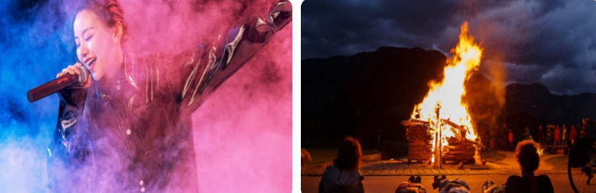 在用火烤熟食物的过程中,便互相拉手围着火堆跳舞以表达自己喜悦愉快的心情,这种欢庆的形式一直延续到今天,就形成了篝火晚会。我们也在户外放上唱歌设备,围着篝火尽情欢唱