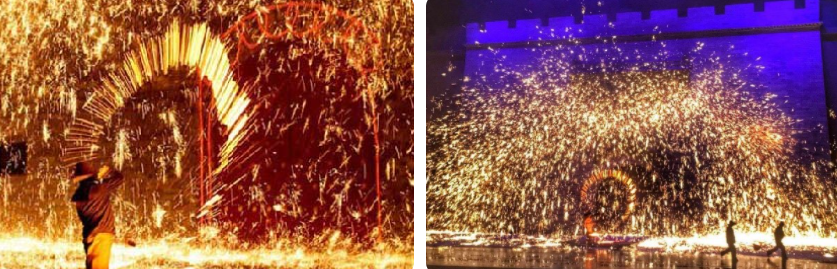 迸溅形成万朵火花,因犹如枝繁叶茂的树冠而称之为"树花",其壮观程度不亚于燃放烟花