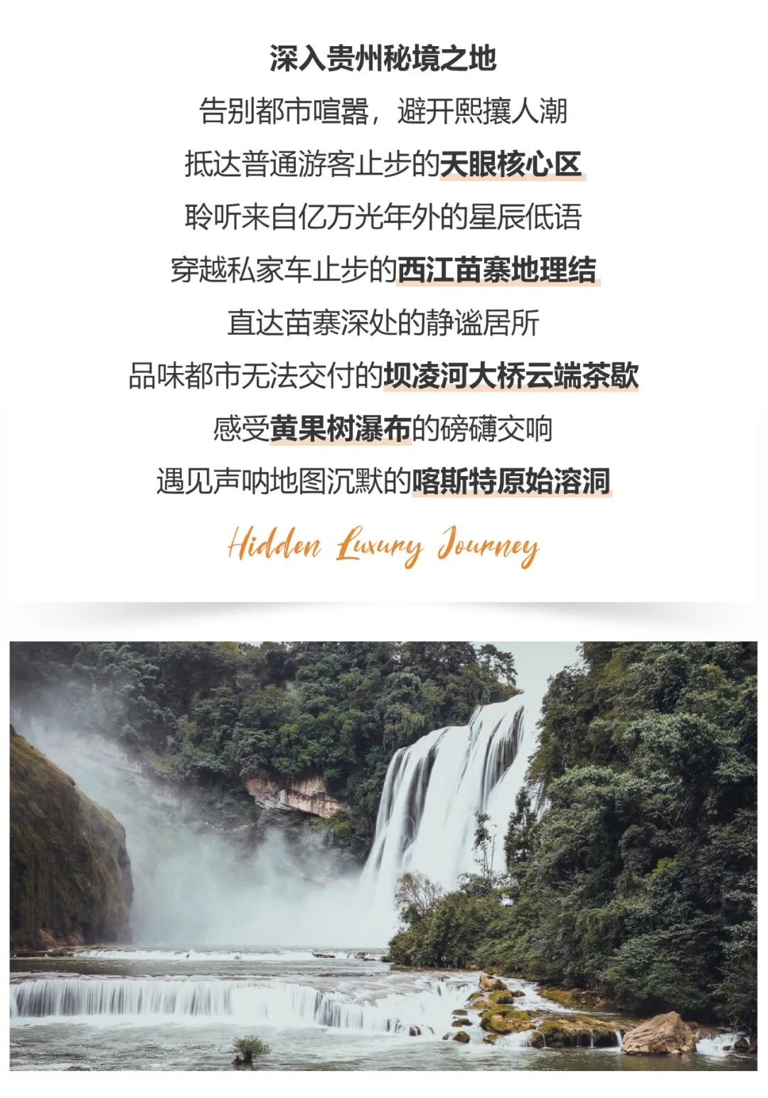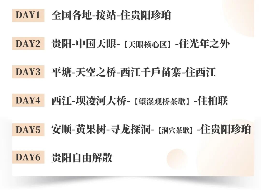 【活动体验】探访天眼核心区、望瀑观桥茶歇、寻龙探秘、洞穴轻奢茶歇;