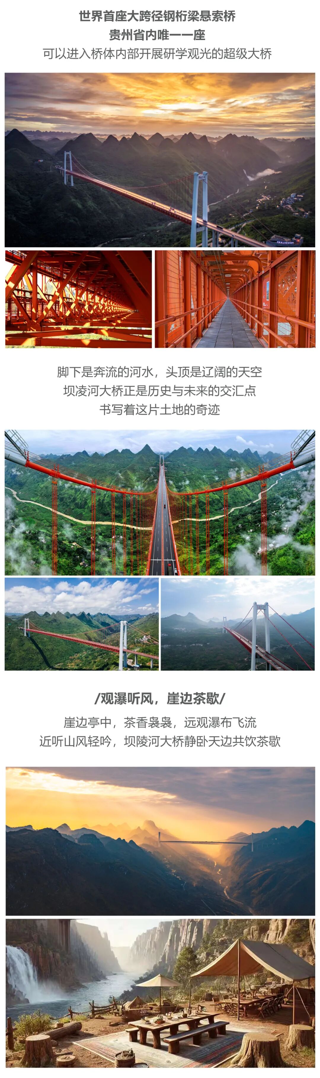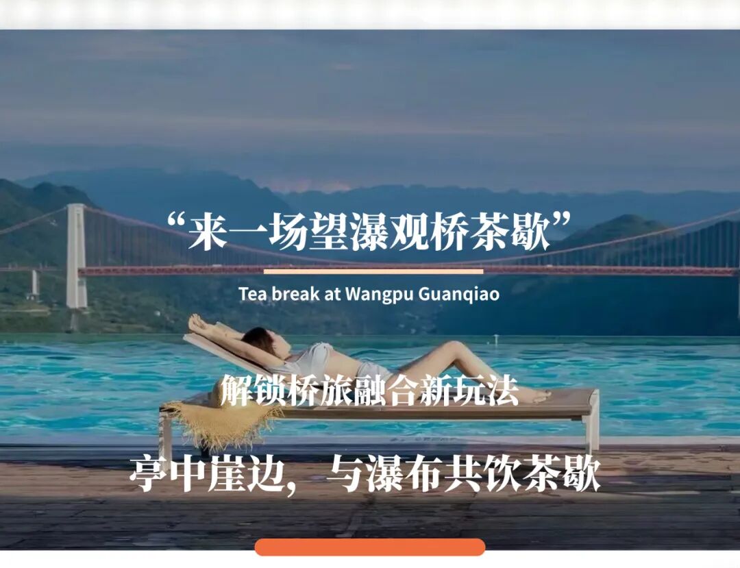 我们一同解锁桥旅融合新玩法,体验崖边亭中,茶香袅袅,远观瀑布飞流的感觉,享受近听山风轻吟,在坝陵河大桥静卧天边【共饮茶歇】的美好。