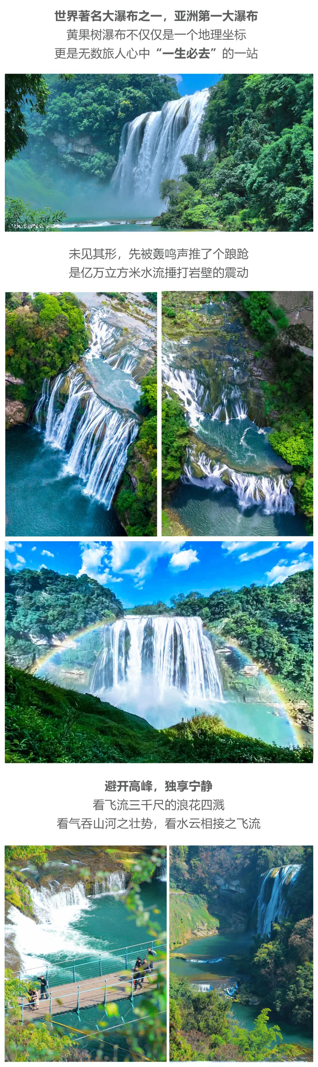 将前往“亚洲第一大瀑布”作为贵州最大经典名片,它的壮观之景毋庸置疑【黄果树大瀑布】景区,感受飞流直下三千尺,疑是银河落九天之气魄,直面大瀑布之震撼。