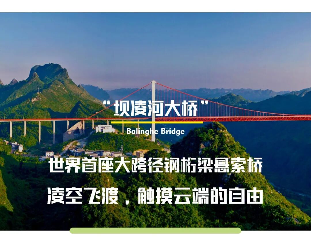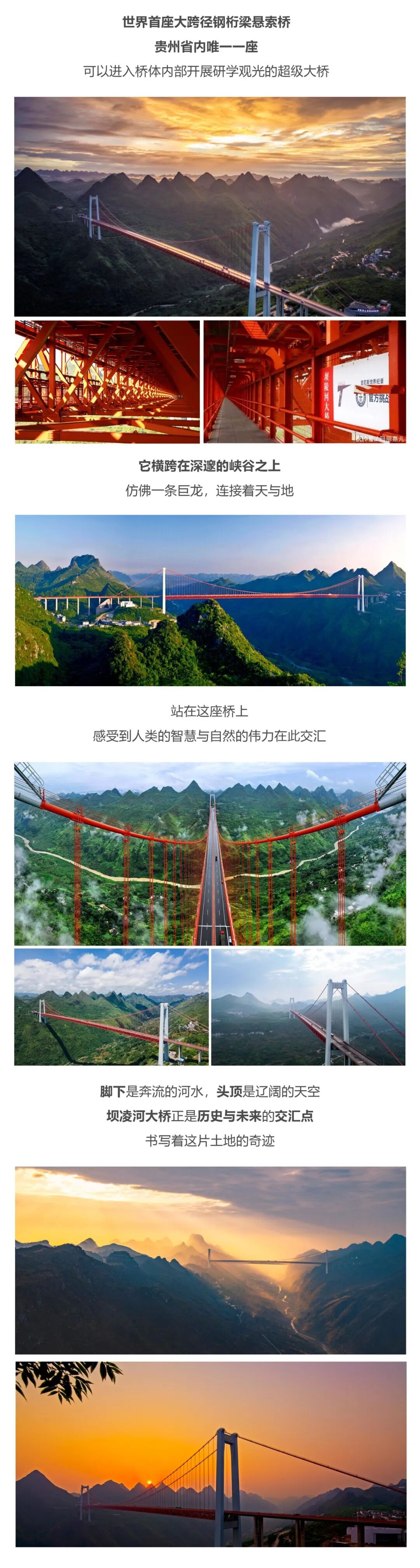 【上午】早餐后,贵州是世界桥梁博物馆,让我们去世界第十高的桥梁走一走,世界吉尼斯记录前十的高桥,有五座在贵州。我们就将登上世界第十的高桥——坝陵河大桥,去近距离感受这近400米高度落差。