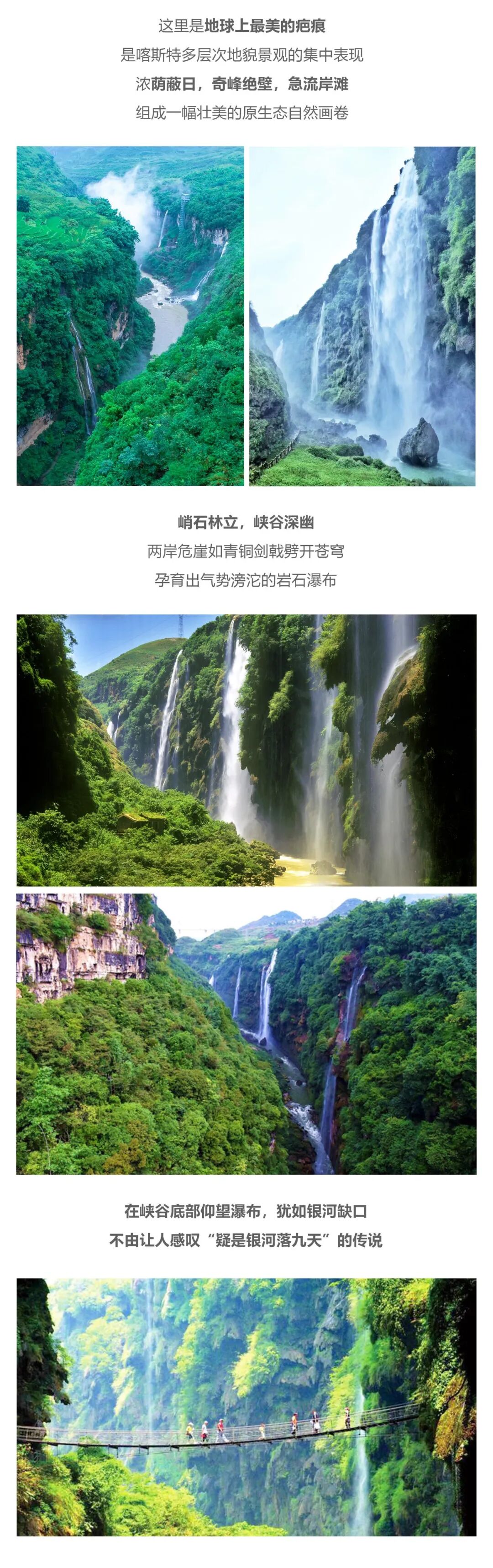 【下午】前往被喻为“地球上最美丽的疤痕”的【马岭河峡谷】,如果用地质学的手术刀去解刨,可见喀斯特多层次的地貌——地缝、峡谷、瀑布、河流和碳酸钙壁挂。其中最具观赏性的还是一道又一道高悬的瀑布,大瀑布如银河跌落,水小的如蜿蜒美丽的女子。