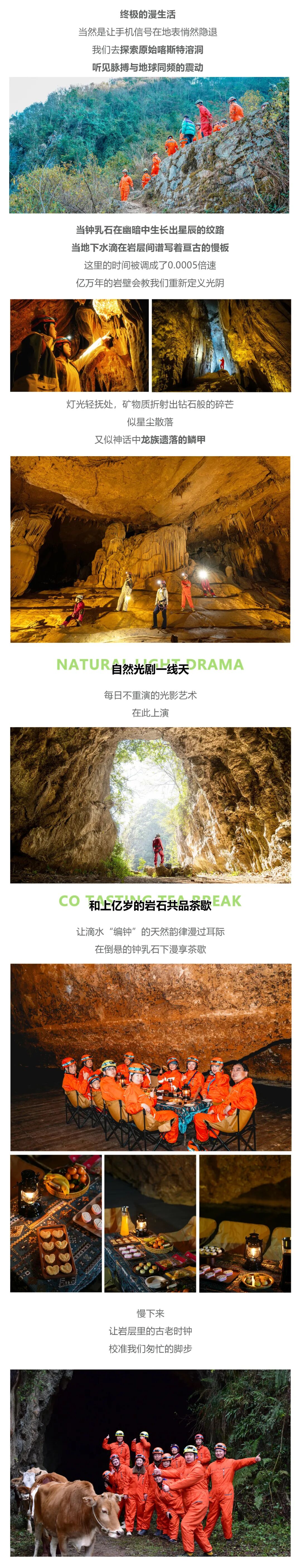 【上午】早餐后,我们睡到自然醒旅程的首个秘境——【寻龙洞】,打卡80年代的喀斯特原始溶洞换好装备后进行热身,徒步至地心深处,欣赏“最不像地球表面”【寻龙洞】,探索地心秘境,洞内钟乳林立,洞顶高悬窿穴,怪石嶙峋,奇峰耸立