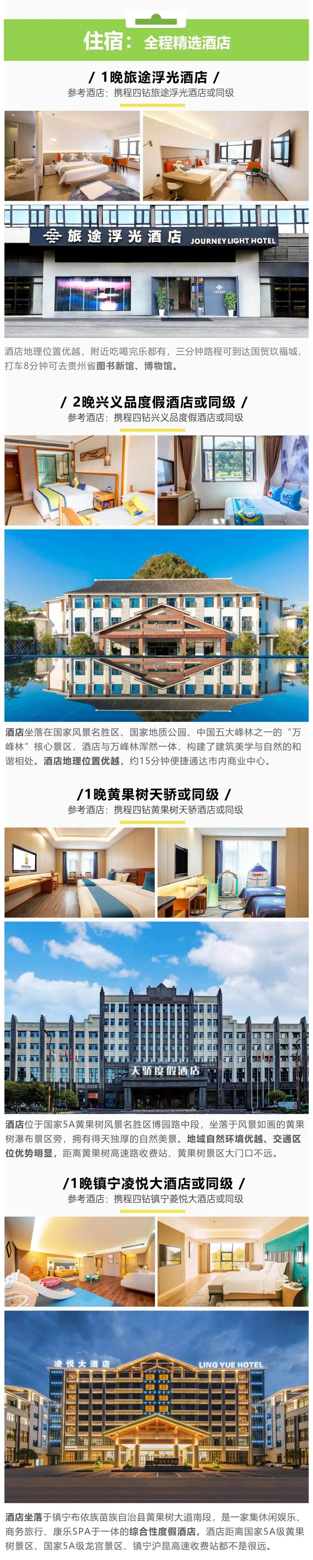 【住宿】贵阳旅途浮光酒店或同级1晚,兴义品度假酒店或同级2晚,黄果树天骄或同级1晚,镇宁凌悦大酒店或同级1晚