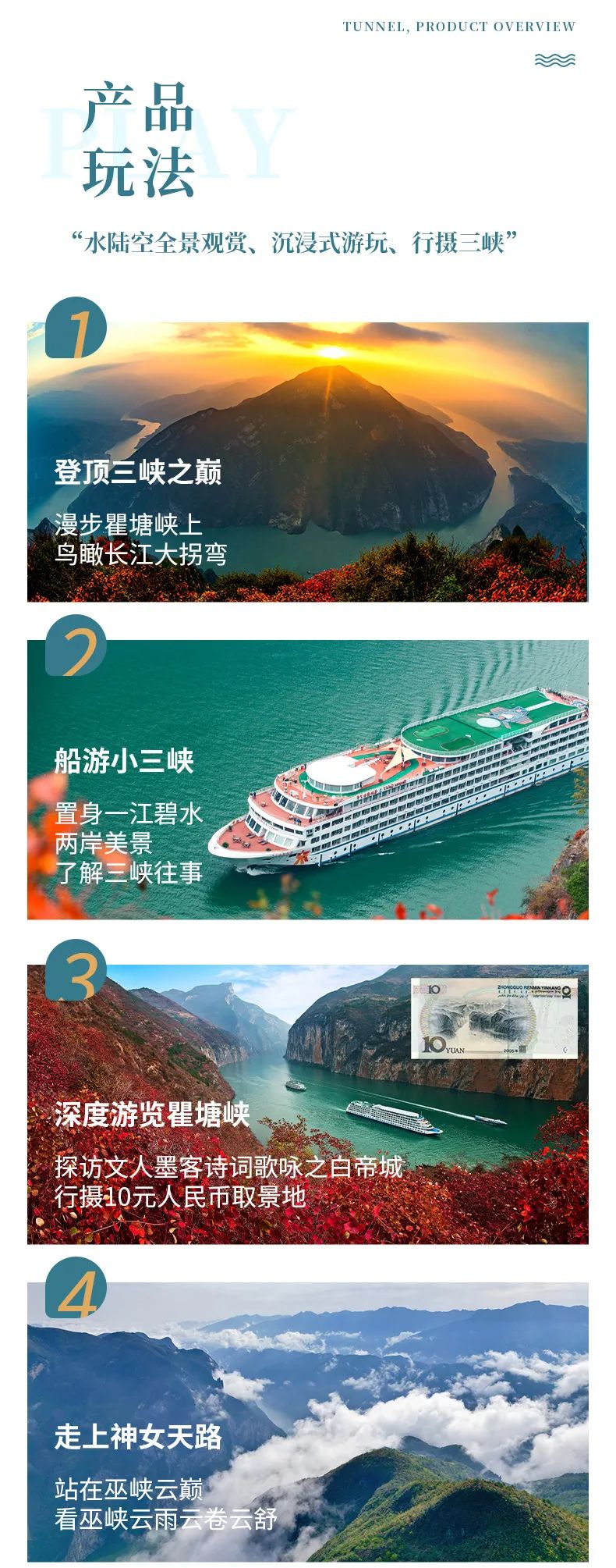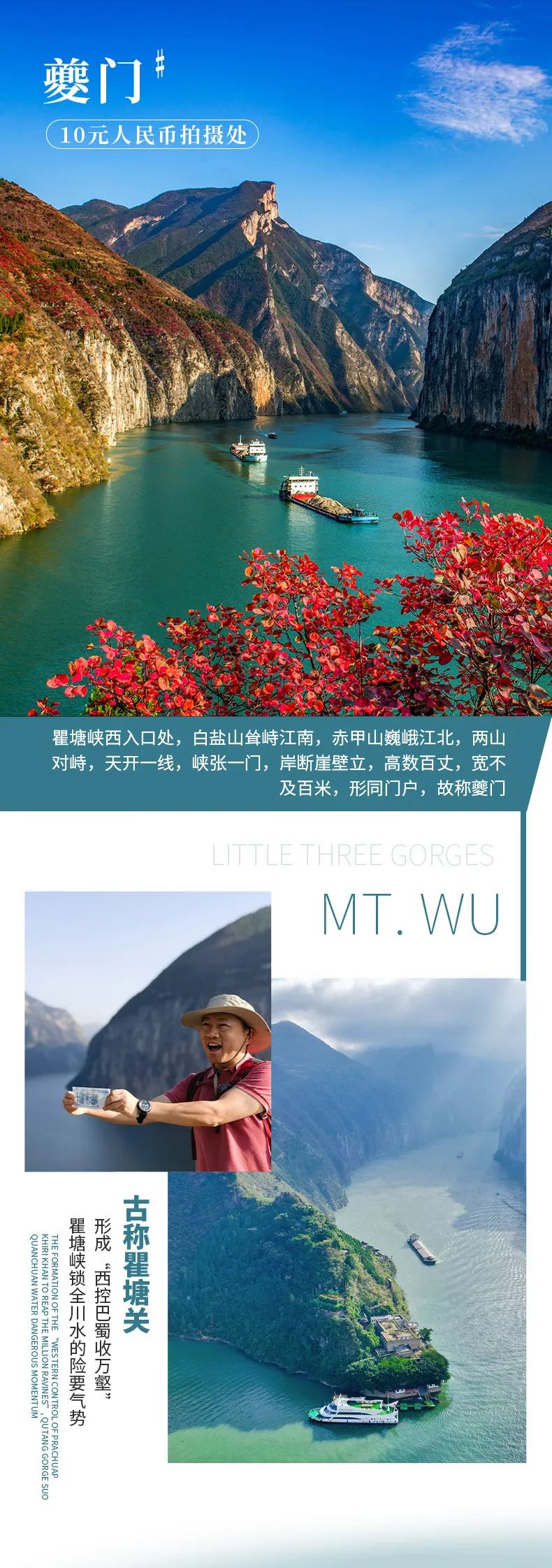 下午我们将到达来到了李白《早发白帝城》这首诗的起源处——白帝城,在白帝城,感受一下古诗词的文化魅力。并且还可以了解白帝城托孤的典故,以及喂一喂“两岸猿声啼不住”的后代。最后打卡10元人民币背景——夔门。