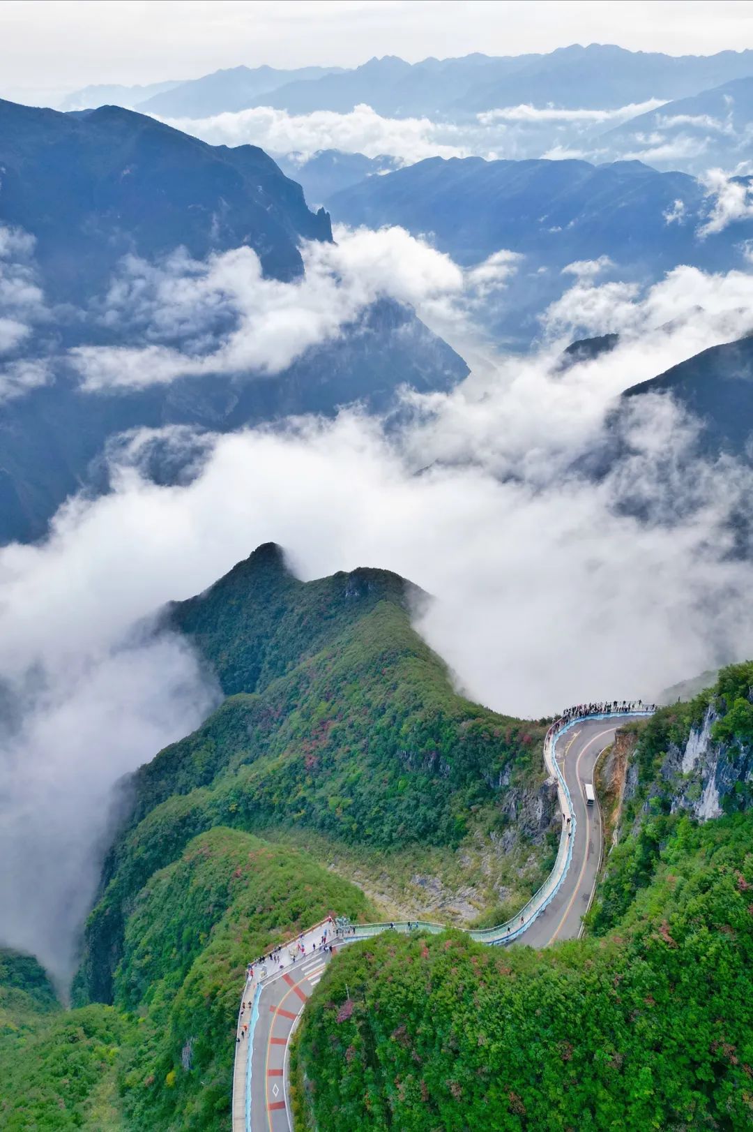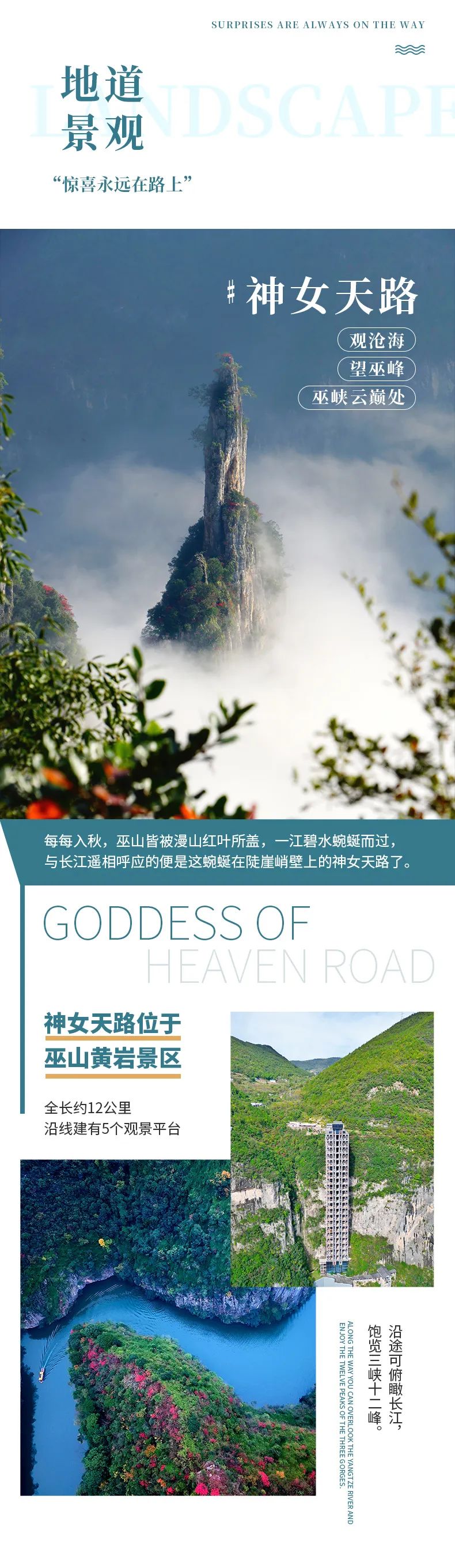 早餐后,我们乘车前往神女天路,在神女天路坐观光车一路前行,公路就如同是挂在云雾间一般,仙气十足,叫作“天路”一点不为过。从沿途的飞云台,瑶台,仙履台等观景台,既可以鸟瞰长江、巫峡、神女溪,对望神女庙、巫山十二峰,更是可以看万山红遍,层林尽染,将重峦叠嶂中的巫山红叶尽收眼底。