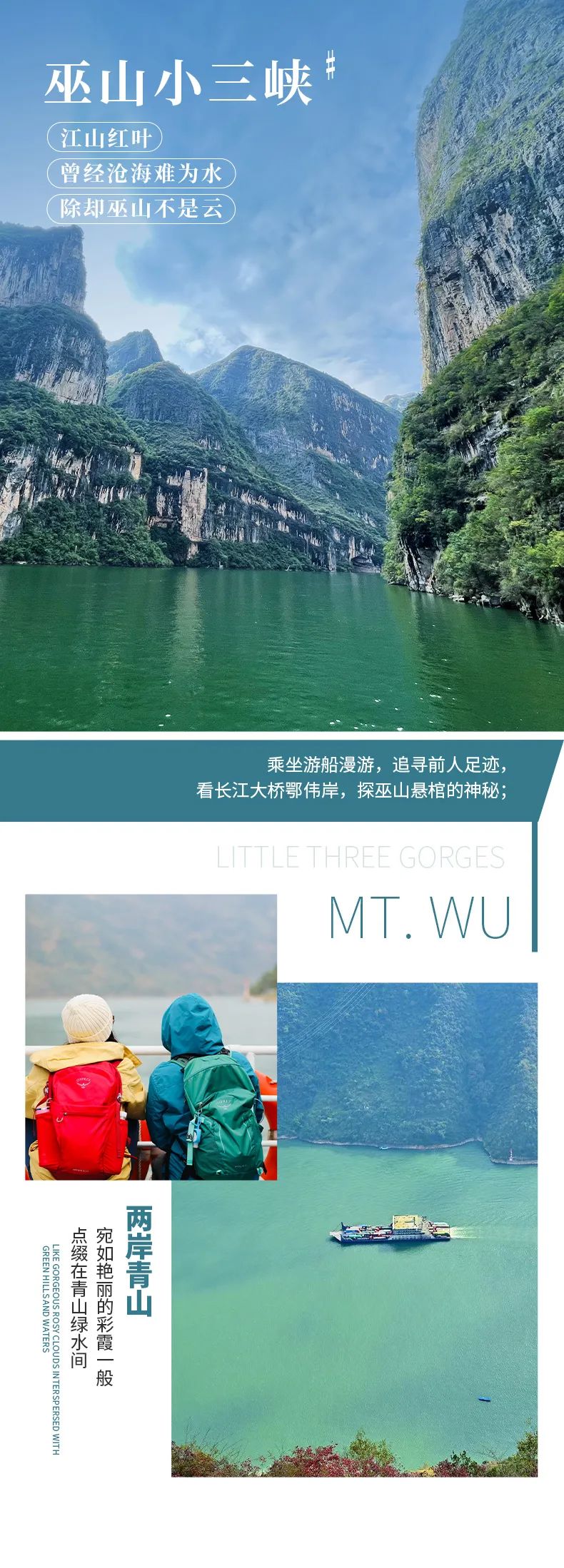 下午乘游船从巫山旅游码头出发前往“巫山小三峡“,穿过巫山长江大桥,就进入长江三峡中的巫峡。