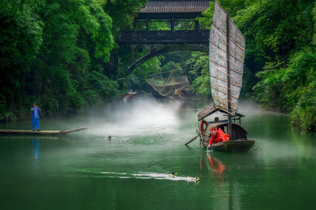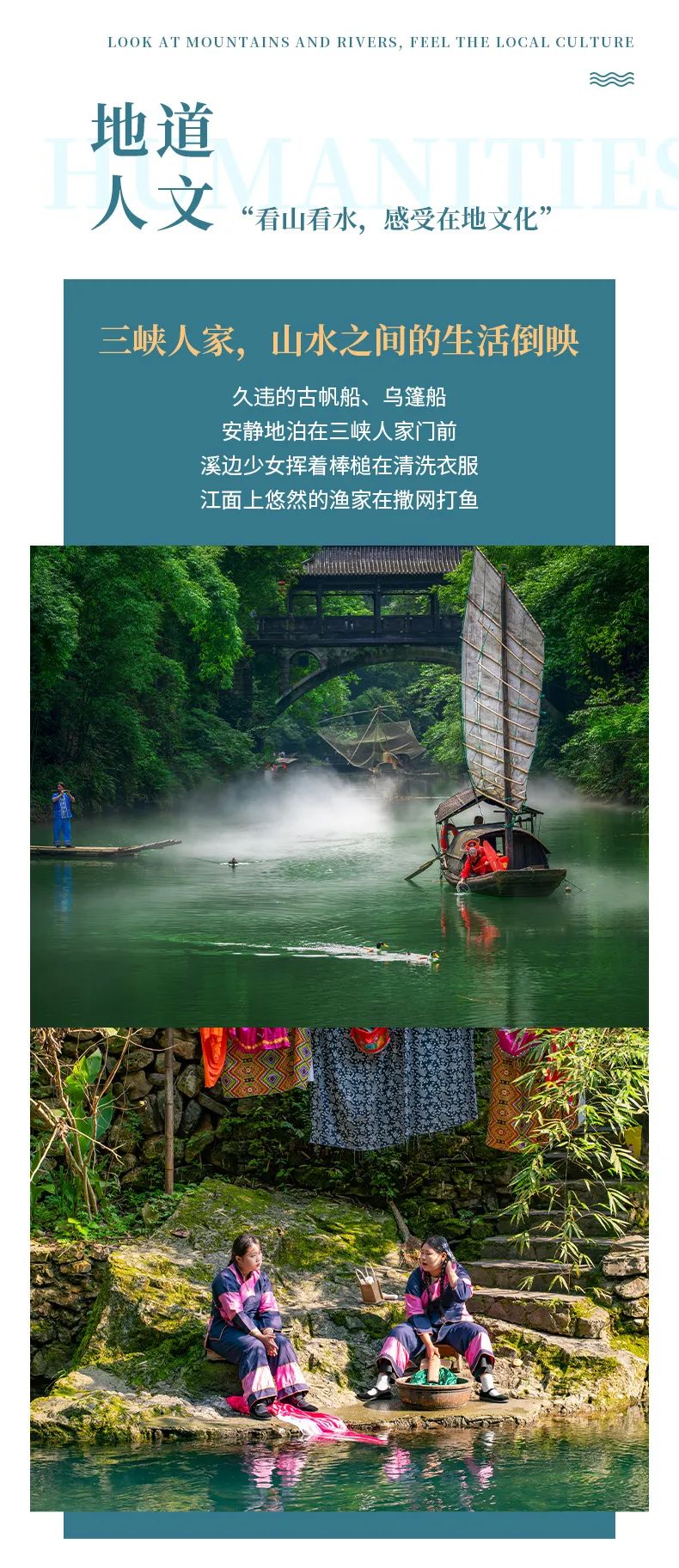 依山傍水,风情如画:传统的三峡吊脚楼点缀于山水之间,久违的古帆船、乌篷船安静地泊在三峡人家门前,溪边少女挥着棒槌在清洗衣服,江面上悠然的渔家在撒网打鱼……