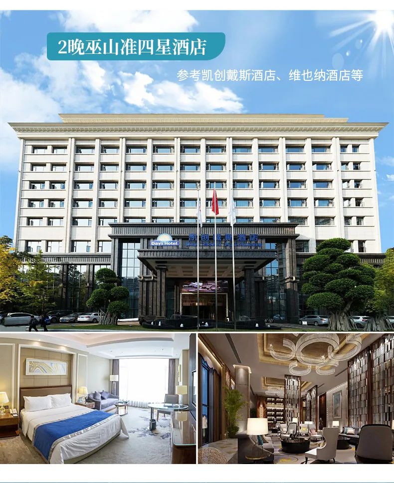 住宿:巫山准四酒店,参考凯创戴斯酒店、鸿飞酒店、维也纳酒店等;
