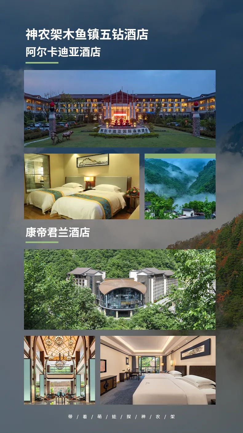 住宿:入住神农架木鱼镇,参考康帝君兰酒店/阿尔卡迪亚酒店等;