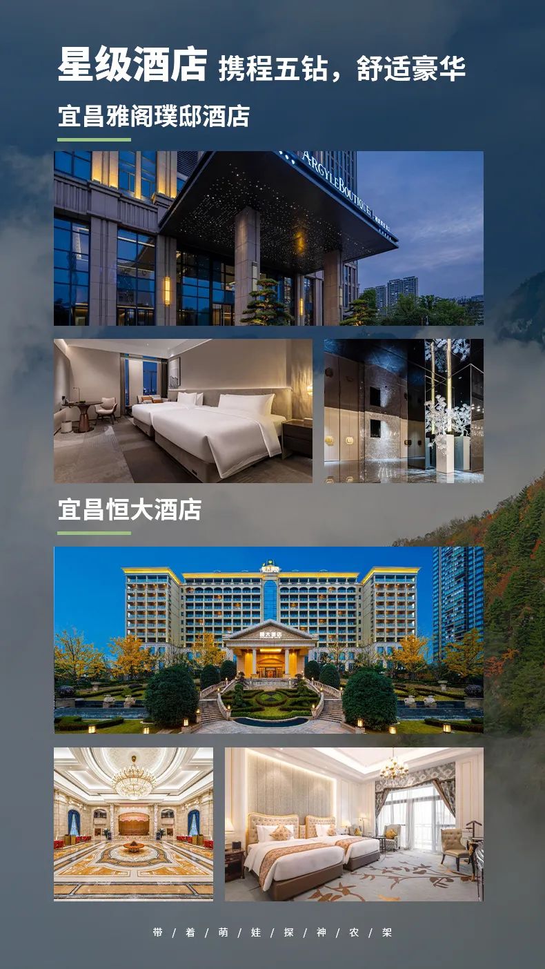 4.住宿:2晚木鱼镇准五酒店,参考木鱼大酒店、康帝君兰酒店或高端民宿;2晚宜昌五星酒店,参考雅阁酒店、恒大酒店,1晚坪阡古镇四钻酒店;