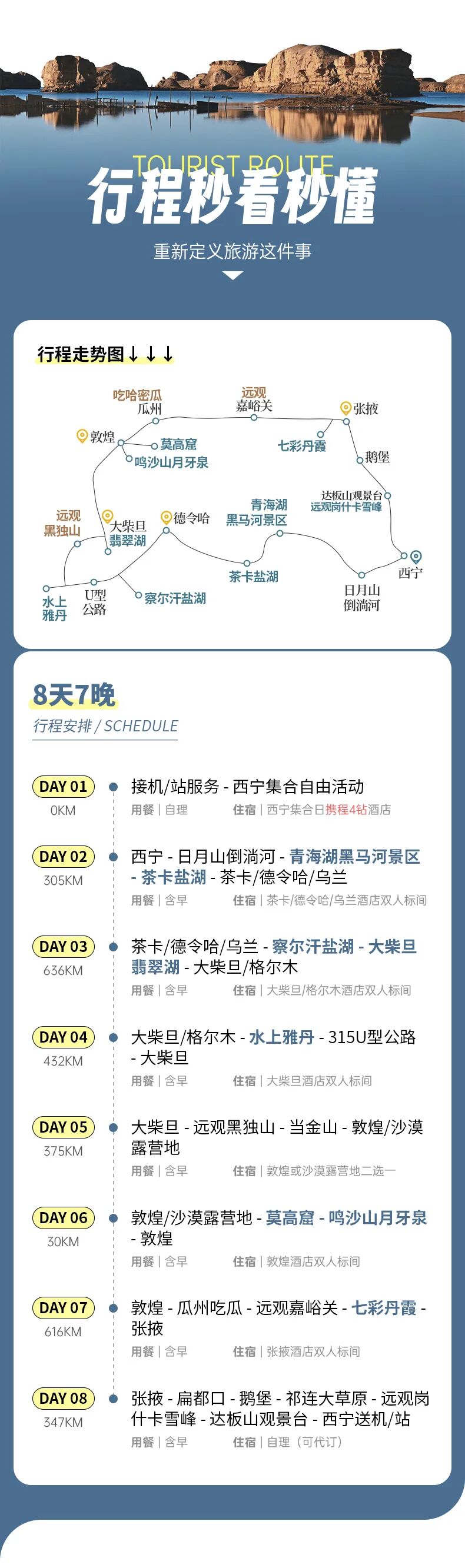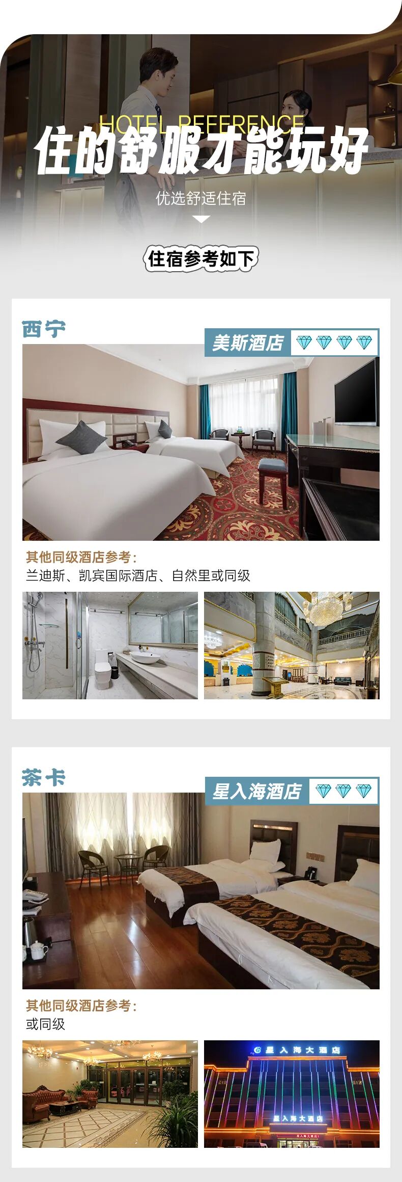行程所列住宿地7晚住宿,每人1床位(含西宁集合日4钻酒店1晚、不住不退不换不指定)具体了解团期价格。