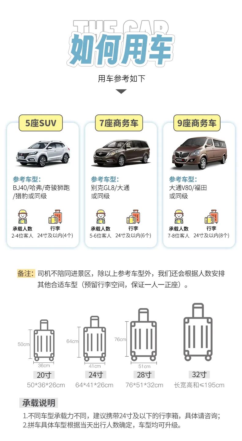备注:车型承载力有限,携带行李为24寸或以下行李箱。