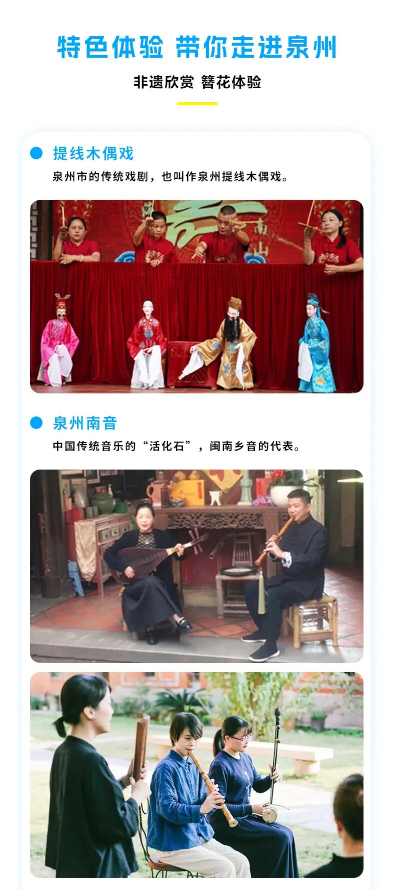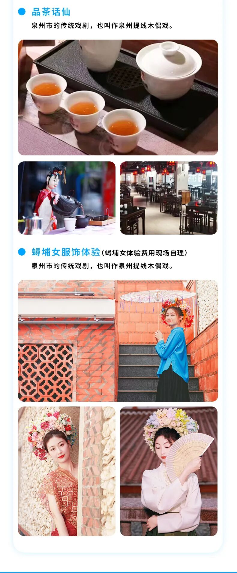 【非遗欣赏】泉州传统民俗众多,是一个历史文化特别浓厚的城市,我们根据时间前往茶馆品茶,观赏南音,木偶戏等传统习俗演出。