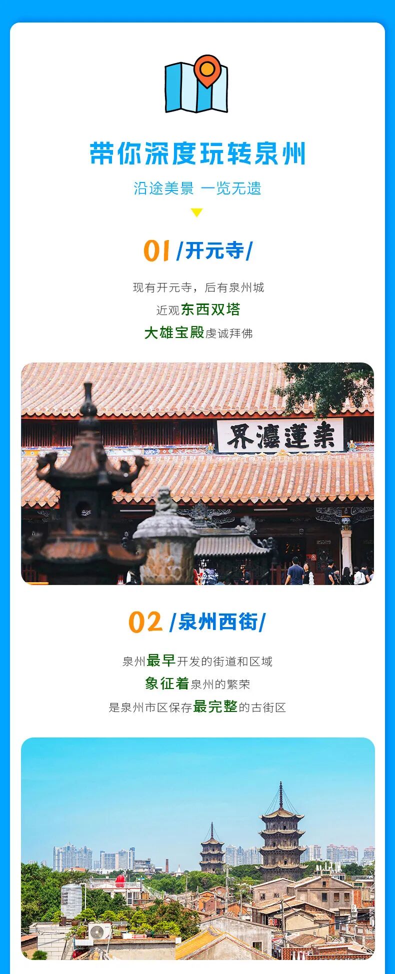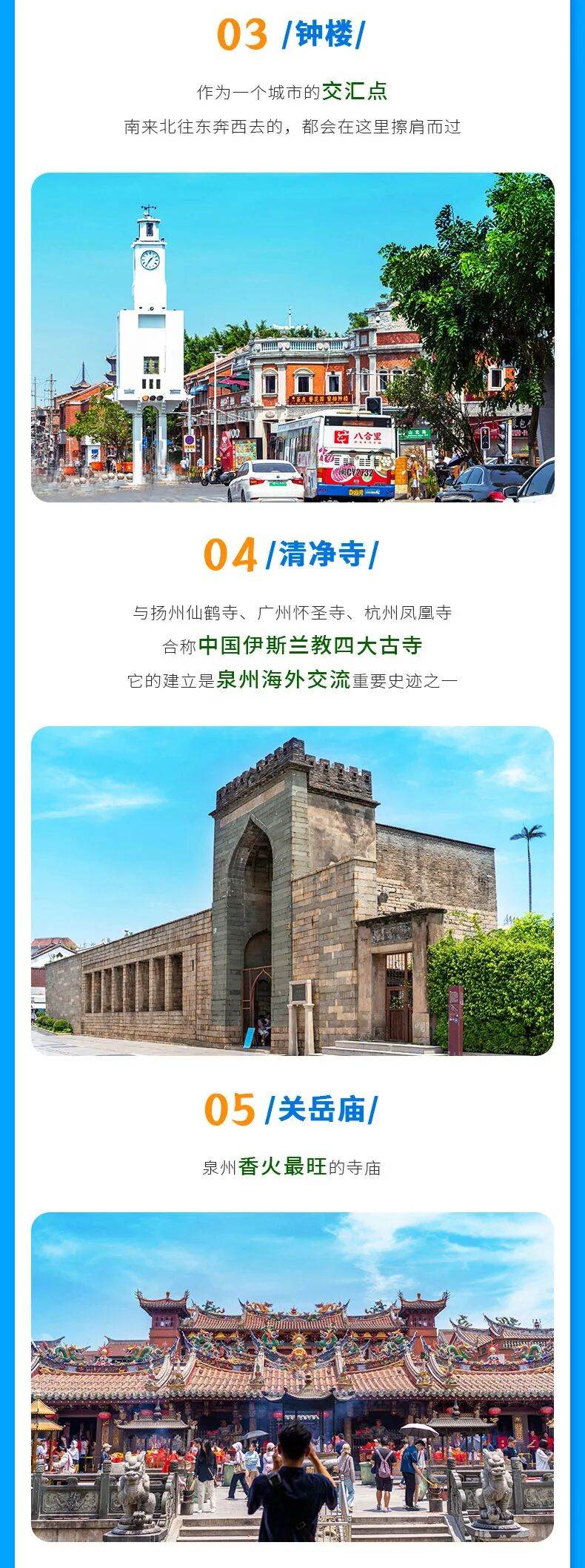 随后依次游览西街、钟楼、清净寺、关岳庙、天后宫、文庙,这些景点围绕着泉州古城而展开。