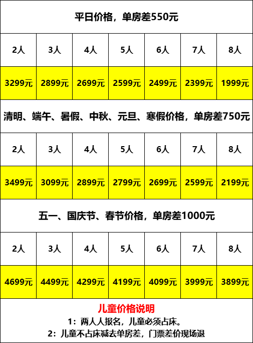 3、本行程门票费用是协议价格核算,12周岁以下按成人操作的儿童和持老人证、军官证、学生证、教师证等其他有效证件享受景区门票优惠的游客不存在价格差异,无差价退还,敬请注意!