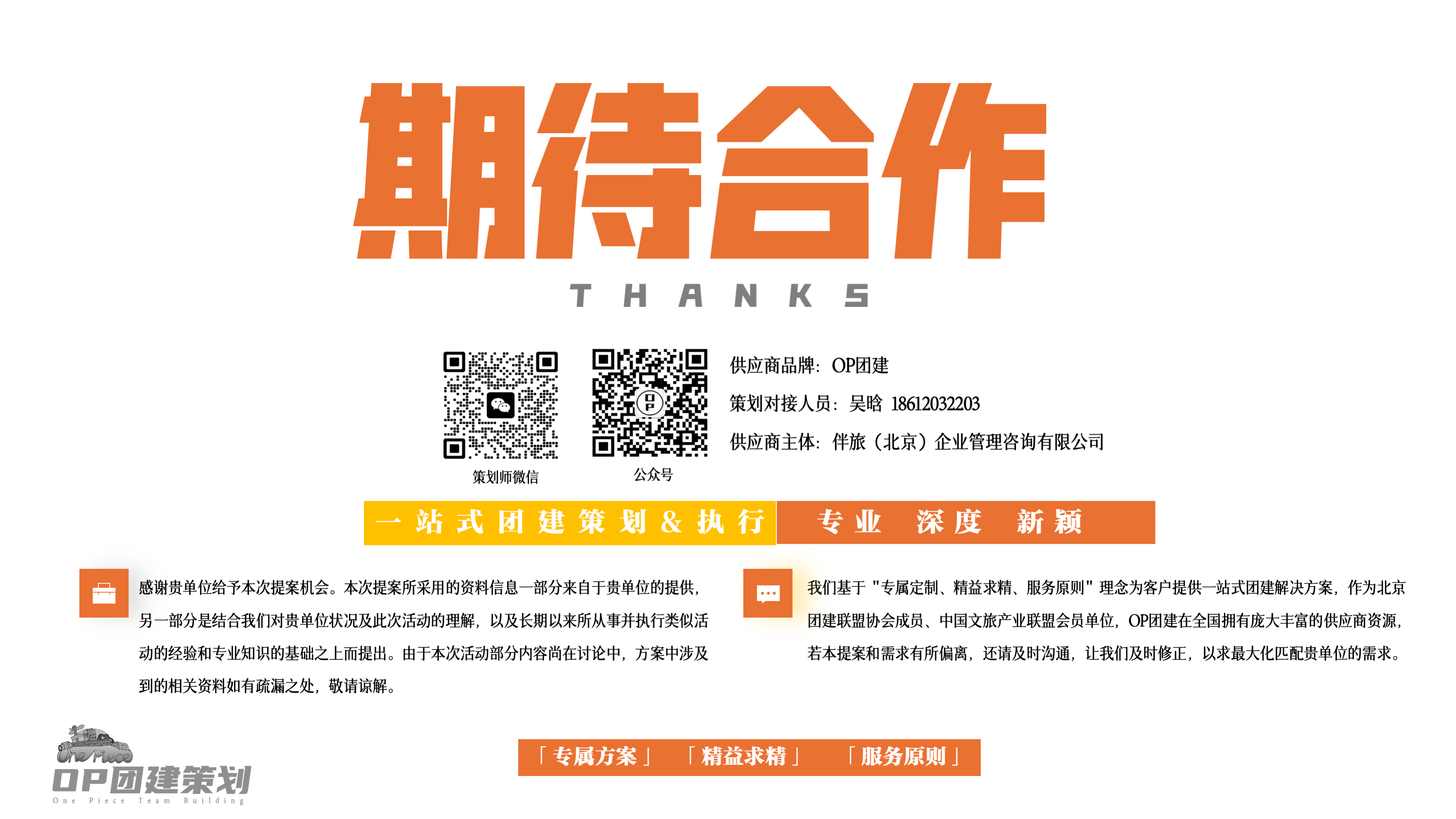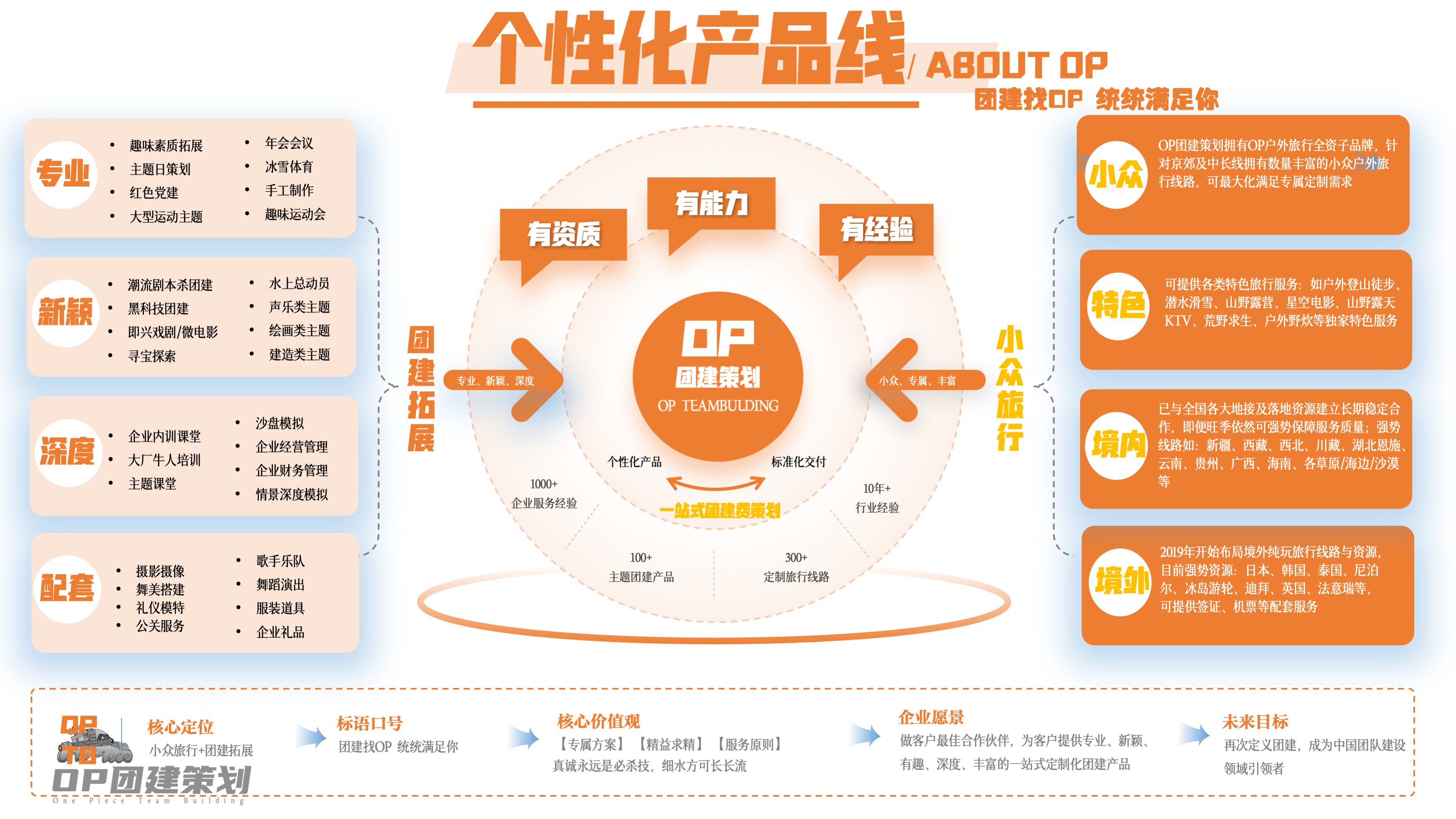 【OP团建】为企业客户提供“周边游+团建”的在线预订服务,是北京团建联盟协会成员、中国文旅产业联盟会员单位,已为全国1000+家优秀企业提供了专业团建定制服务,并建立了完整成熟的供应商体系,拥有庞大的资源积累及服务经验。 团建产品线涵盖户外拓展培训、企业管理内训、会议年会、主题团建大课堂、沙盘模拟、互联网科技团建、声乐体验、手工制作、户外徒步露营、红色党建、国内外旅游服务等。