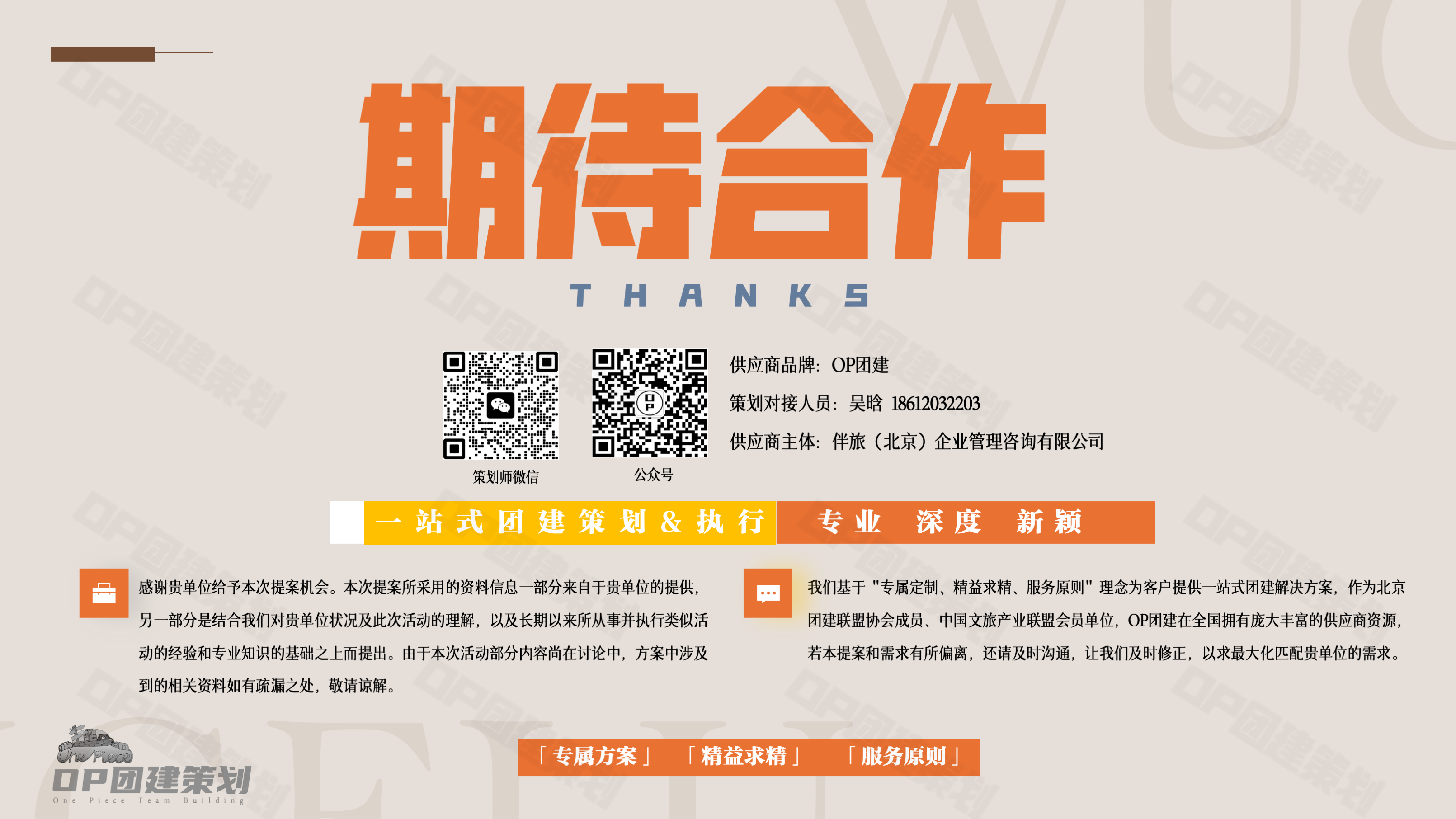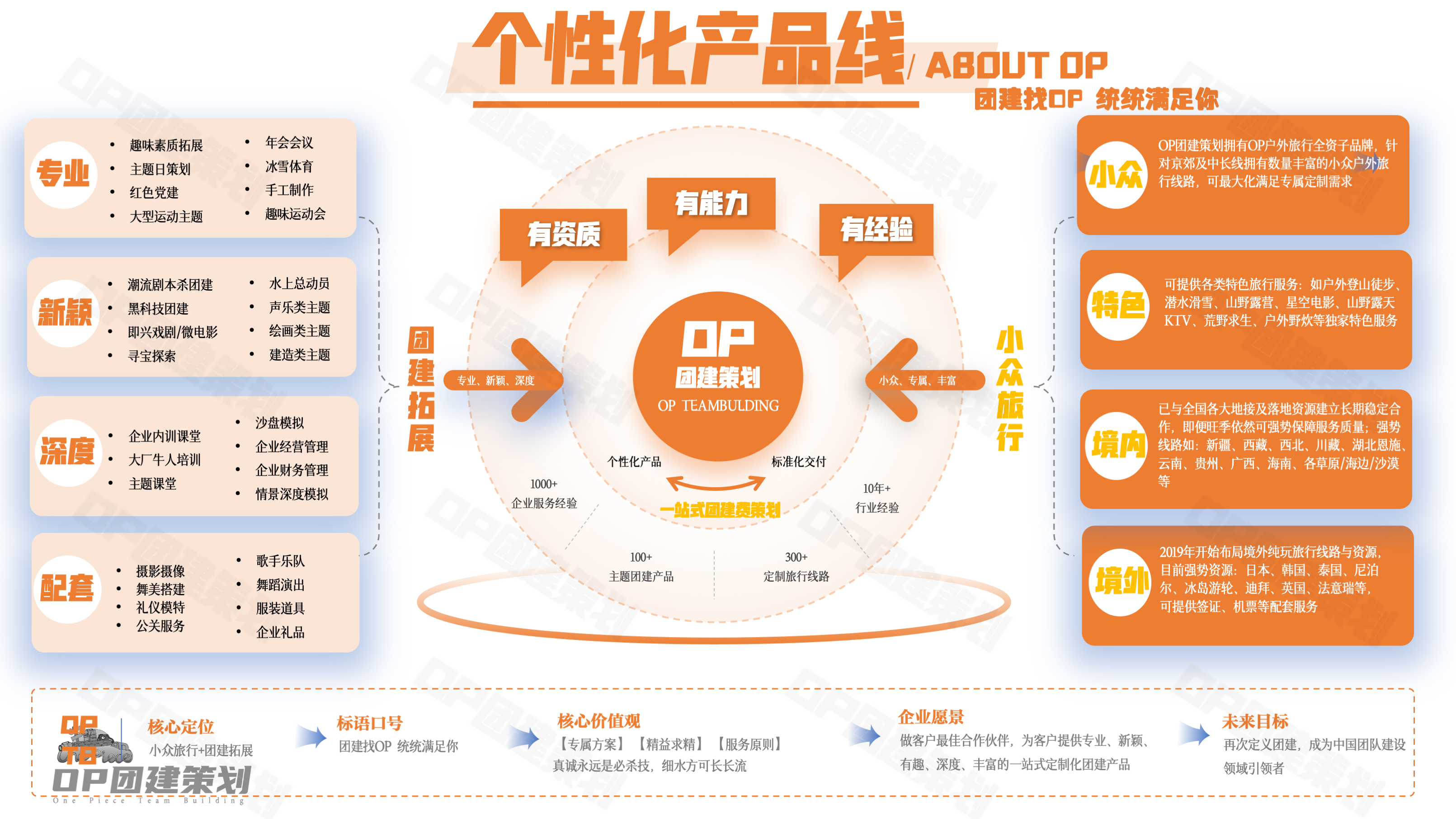 【OP团建】为企业客户提供“周边游+团建”的在线预订服务,是北京团建联盟协会成员、中国文旅产业联盟会员单位,已为全国1000+家优秀企业提供了专业团建定制服务,并建立了完整成熟的供应商体系,拥有庞大的资源积累及服务经验。 团建产品线涵盖户外拓展培训、企业管理内训、会议年会、主题团建大课堂、沙盘模拟、互联网科技团建、声乐体验、手工制作、户外徒步露营、红色党建、国内外旅游服务等。
