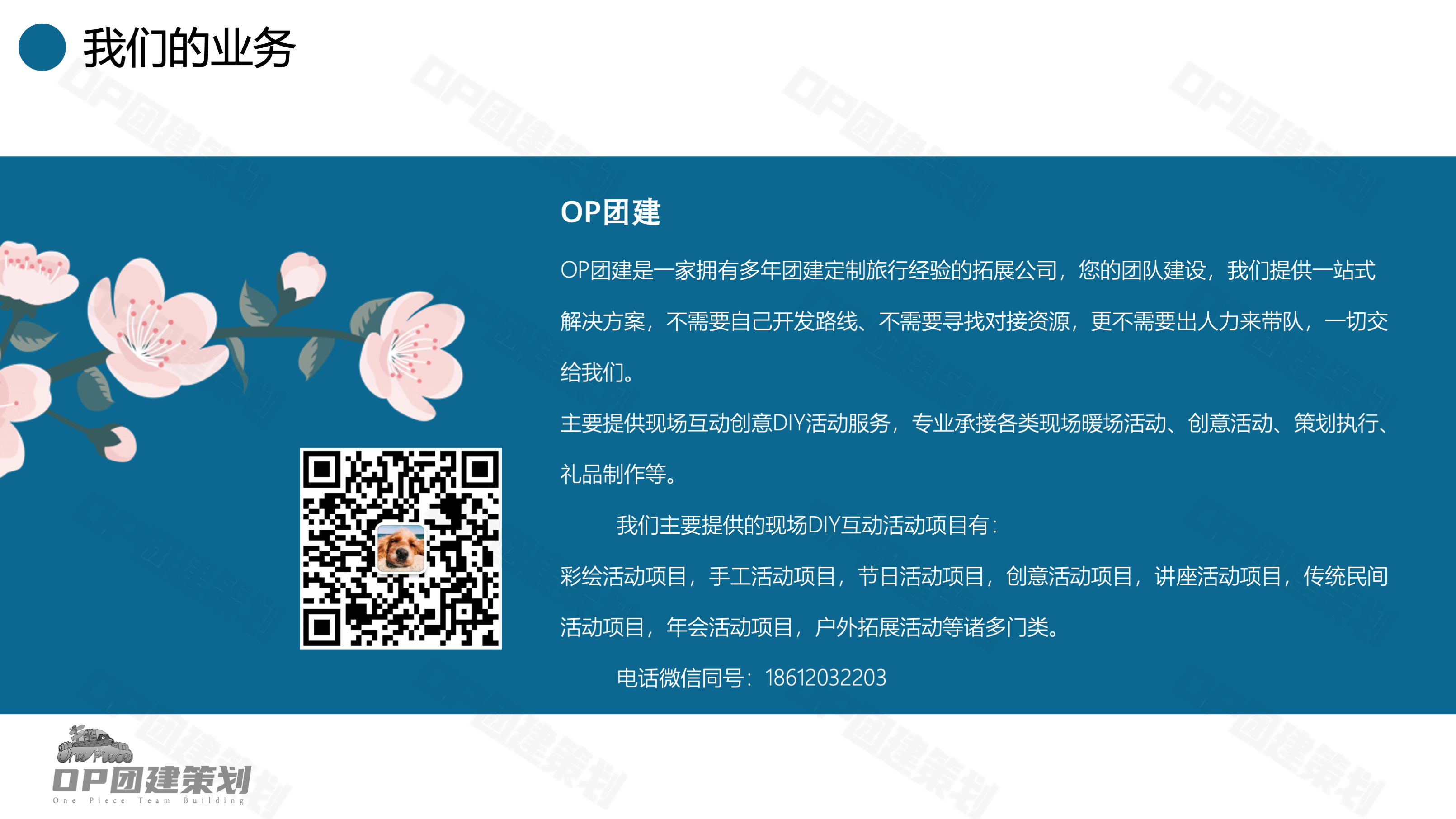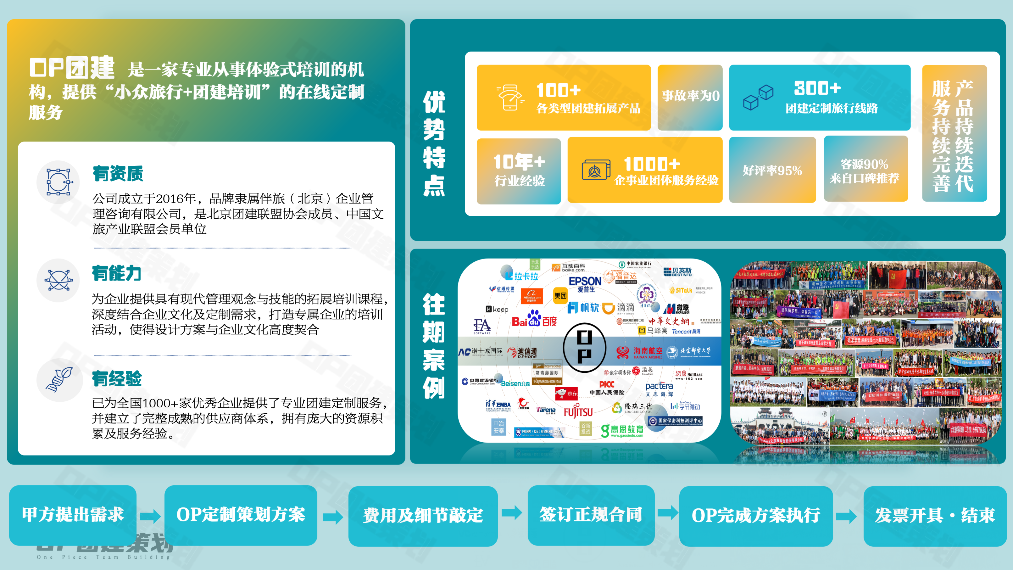 【OP团建】为企业客户提供“周边游+团建”的在线预订服务,是北京团建联盟协会成员、中国文旅产业联盟会员单位,已为全国1000+家优秀企业提供了专业团建定制服务,并建立了完整成熟的供应商体系,拥有庞大的资源积累及服务经验。