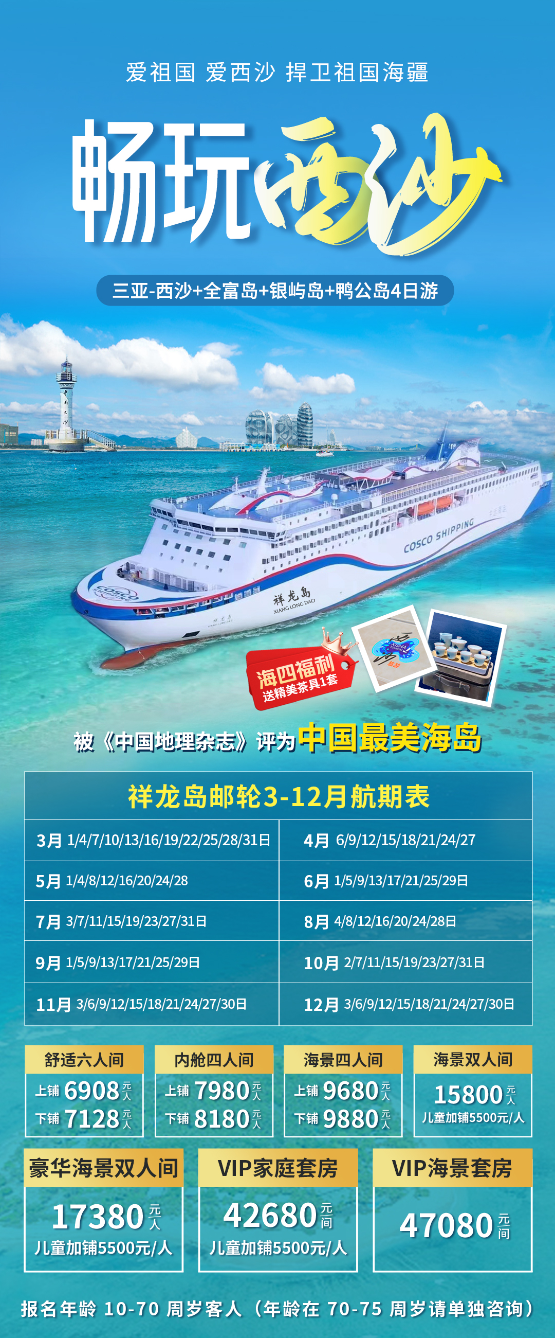 超龄的客人另附正规医院《体检报告》和《免责声明》向船方申请。申请表通过即可购买机票,然后前往西沙旅游。申请表未通过则不可报名,请知晓!