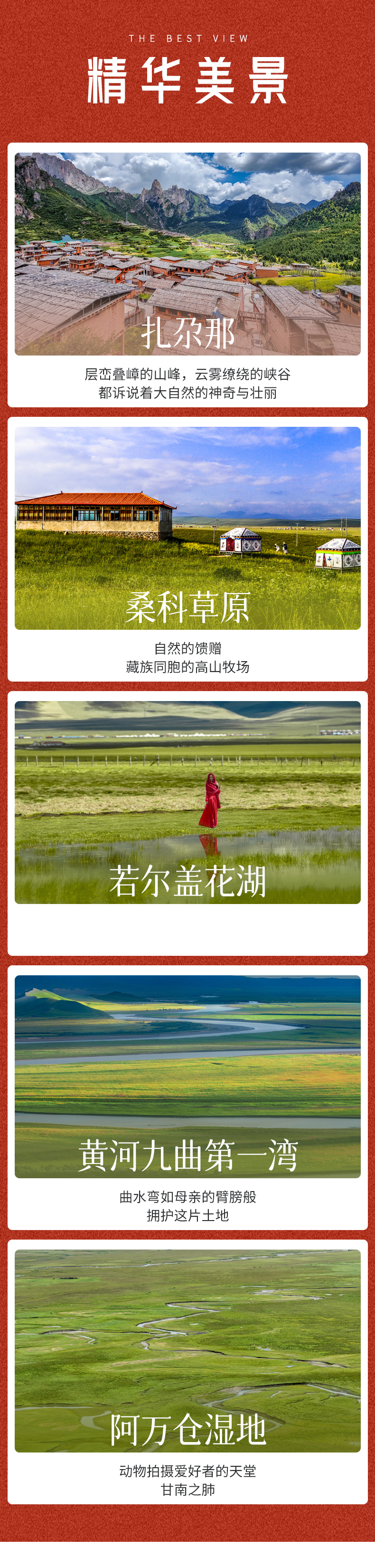 阿坝县-(146km,约2h)黄河九曲第一湾-若尔盖大草原骑马(100km,约2h)-若尔盖花湖-(30km)-郎木寺/纳摩大峡谷轻徒步-郎木寺镇
