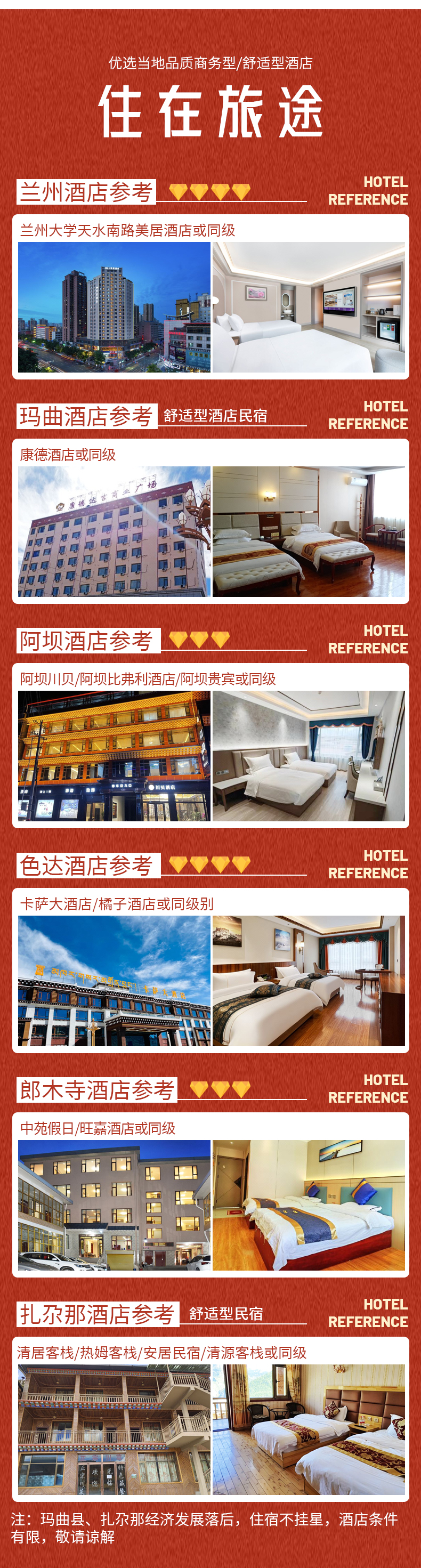 1. 住宿:兰州4钻/星酒店标间1晚、玛曲县舒适型酒店标间1晚、阿坝县3钻/星酒店标间2晚、色达4钻/星酒店标间1晚、郎木寺镇3钻/星酒店标间1晚、扎尕那藏式民宿标间1晚