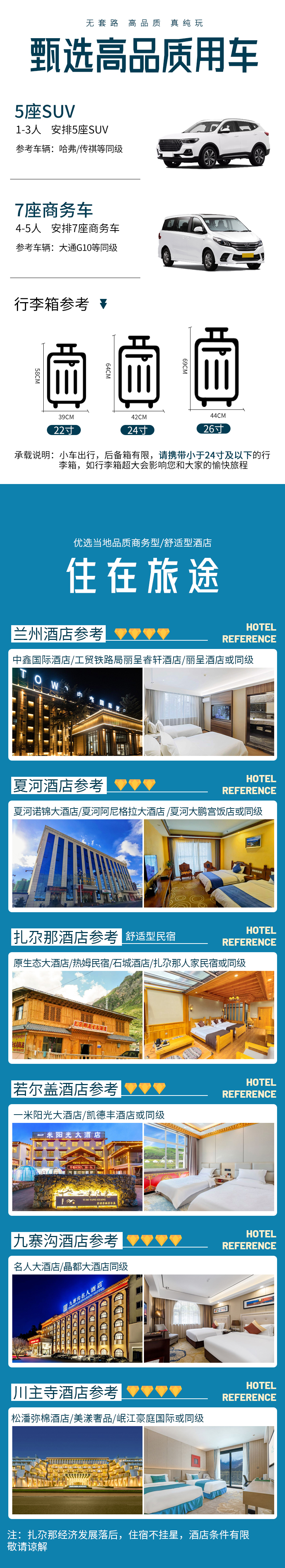 1、住宿:兰州4钻酒店标间1晚、夏河县3钻酒店标间1晚、扎尕那藏式民俗标间1晚、若尔盖县3钻酒店标间1晚、九寨沟沟口4钻酒店标间1晚、川主寺镇4钻酒店标间1晚