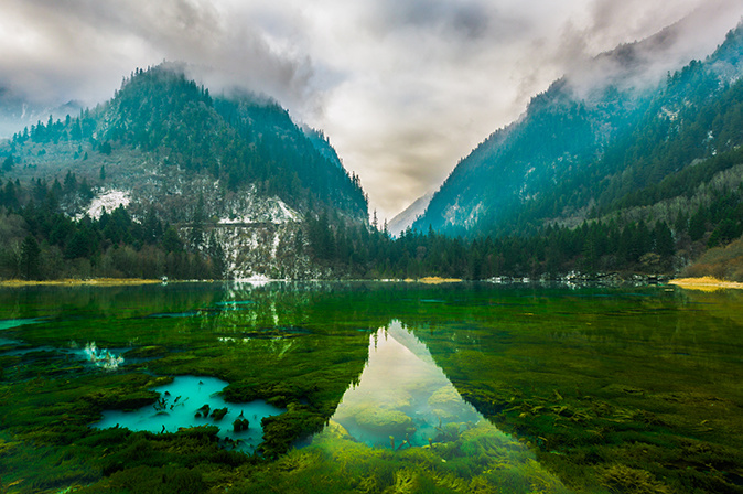【日则沟】的珍珠滩犹如一面巨大晶莹的窗帘,给人一种“滚滚银花足下踩,万顷珍珠拥入怀”的感觉。五花海是九寨沟的骄傲,有着“九寨精华”及“九寨一绝”的美誉。