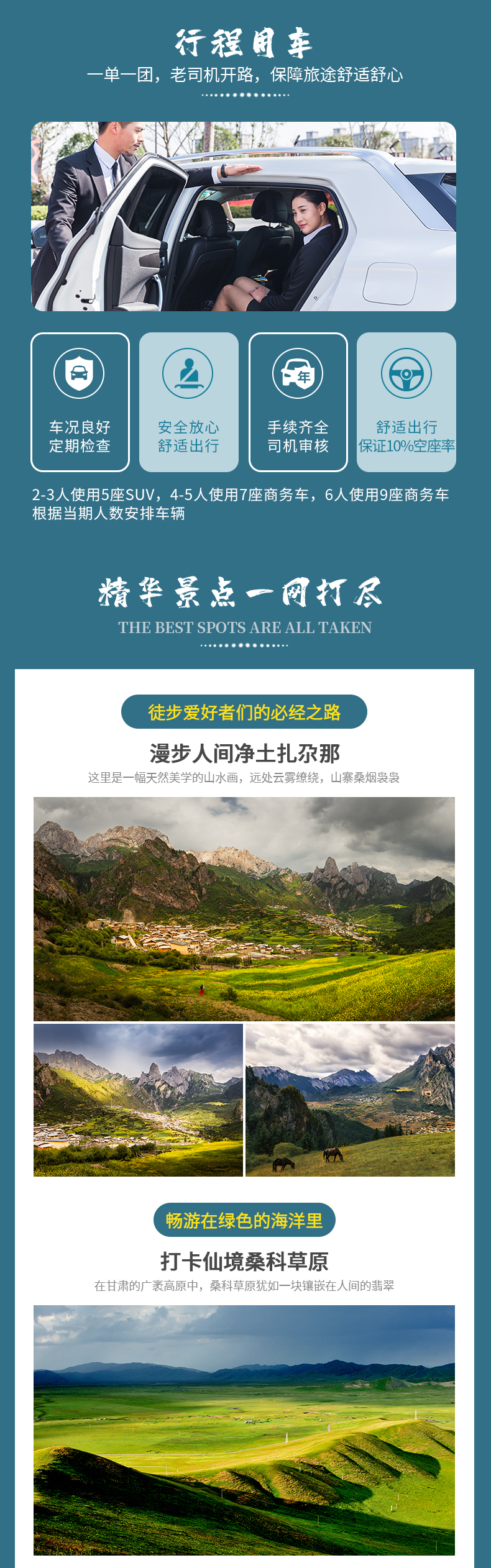 3.交通:2-3人使用5座SUV,4-5人使用7座商务车,6人使用9座商务车,根据当期人数安排车辆。