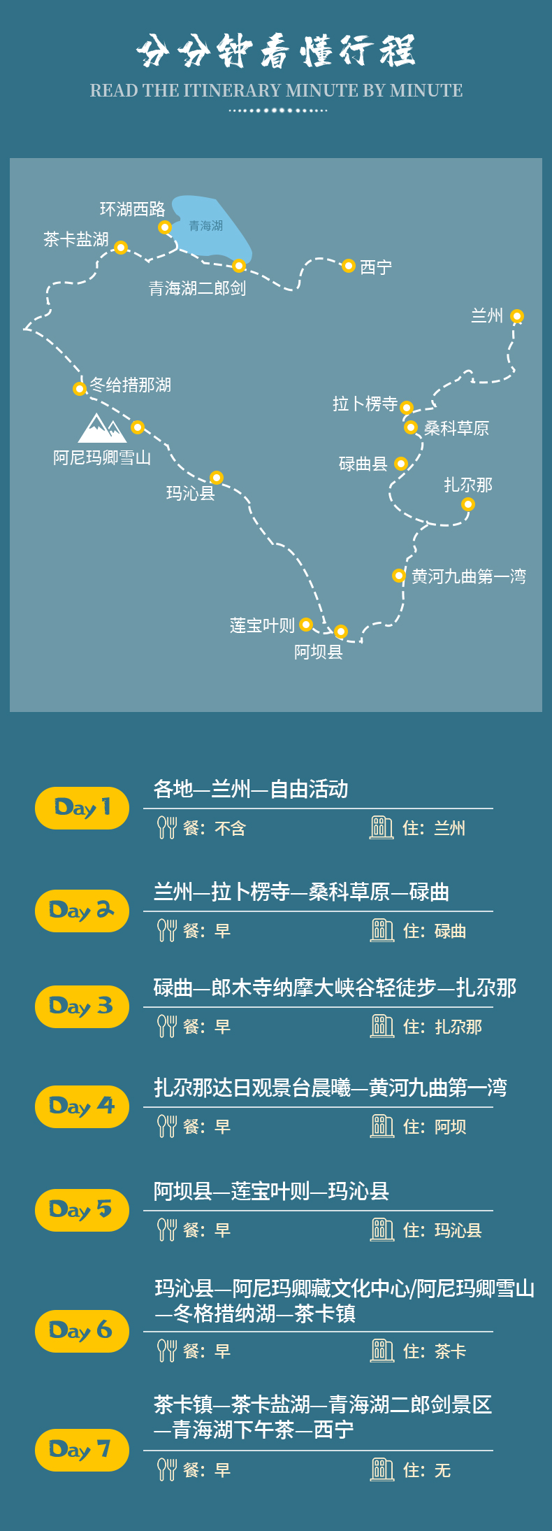 1.住宿:兰州4钻酒店标间1晚、碌曲3钻酒店标间1晚、扎尕那舒适型藏式民宿标间1晚、阿坝3钻酒店标间1晚、玛沁3钻酒店标间1晚、茶卡镇3钻酒店标间1晚