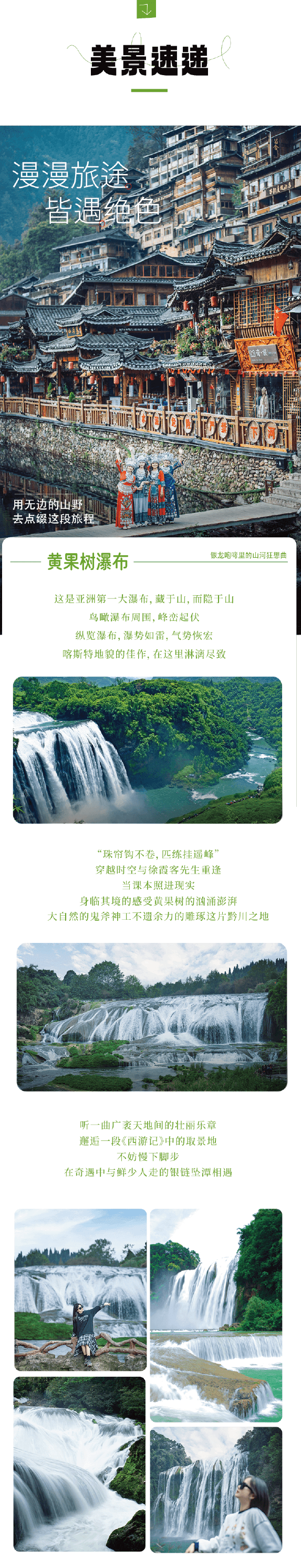 当天游览时间较长且路况以台阶为主,请穿舒适的运动鞋;黄果树景区内餐厅较少,沿途有较多服务区可以简单解决午餐,如个人有特殊要求可自行携带适量干粮食品备用。
