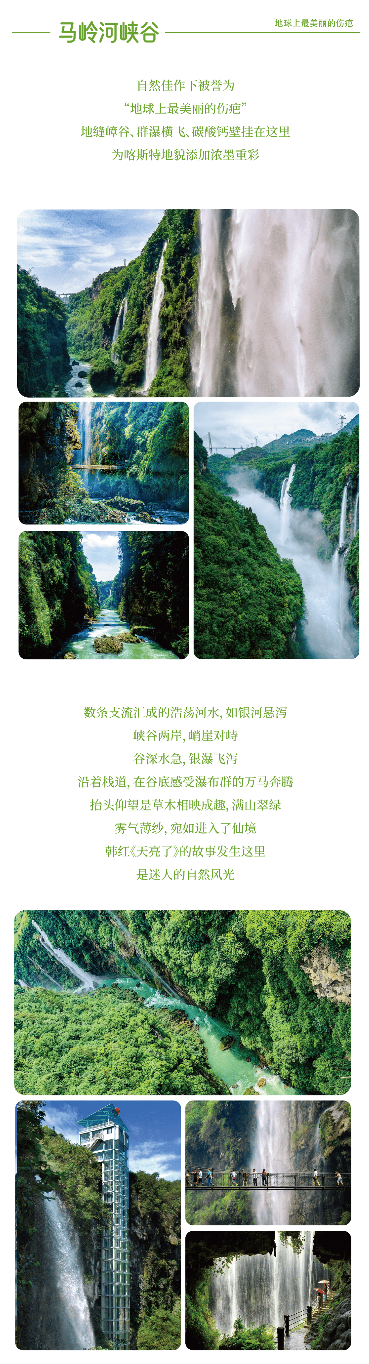 下午前往地球上最美丽的伤疤-马岭河峡谷,我们将沿着谷底的古驿道徒步而下,一路上瀑布相伴,经过落差大、规模大的瀑布时,耳边便轰隆作响,水流自峰顶极速流下,犹如万马奔腾般。随后乘车前往罗甸县城入住酒店。