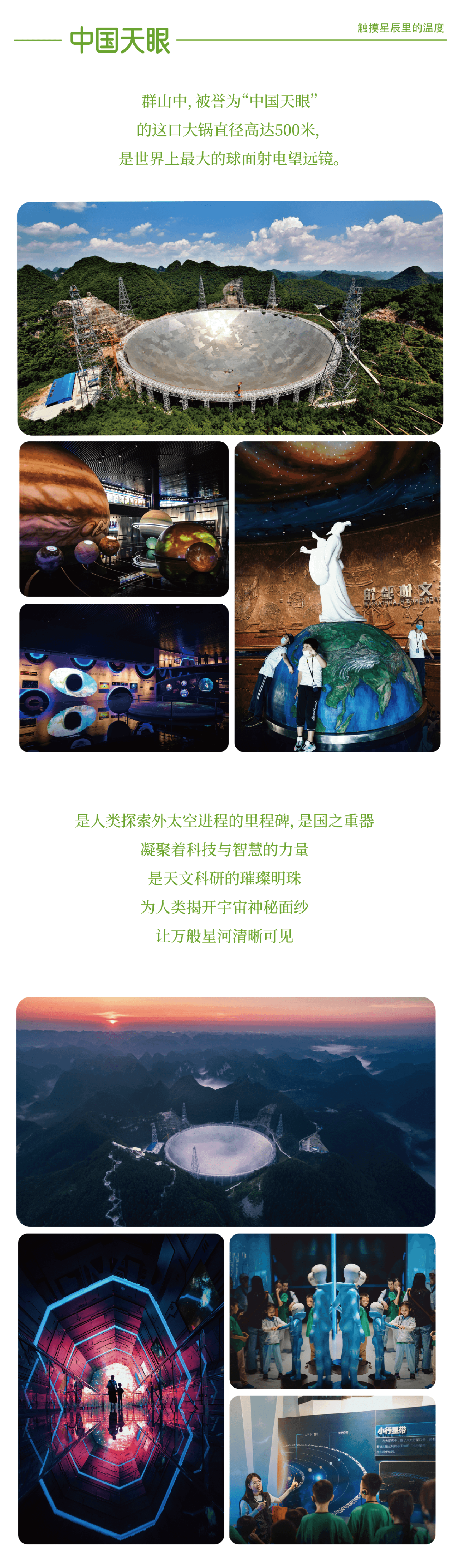 早餐后登中国天眼的瞭望台俯览射电望远镜,我们沿着登山步道抵达世界最大射电望远镜FAST,感受老一辈科学家们对国家天文事业的辛勤付出,了解天眼工作原理,感受大国的科技力量;下午参观参观天文体验馆/天象影院/南仁东纪念馆,通过体验馆里的图文讲解及视频观看了解外太空星体的秘密,感受亿万光年之外宇宙世界以及黑洞的秘密;