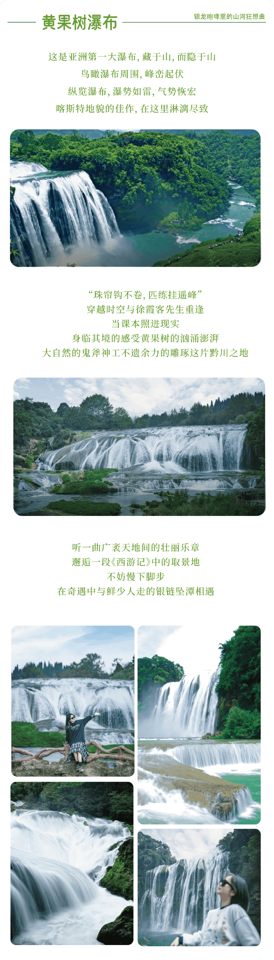 当天游览时间较长且路况以台阶为主,请穿舒适的运动鞋;黄果树景区内餐厅较少,沿途有较多服务区可以简单解决午餐,如个人有特殊要求可自行携带适量干粮食品备用。