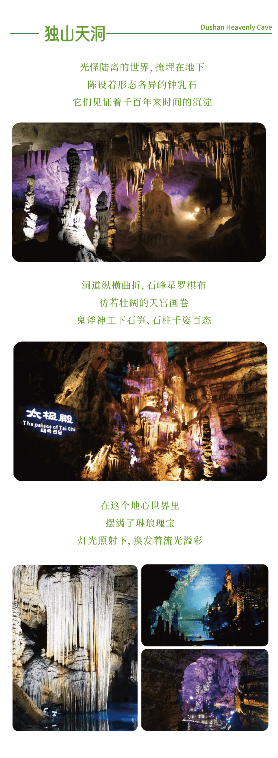 下午乘车前往独山天洞,走在这隐匿于时光深处的奇洞之中,仿佛走进了地心世界般,洞内石钟乳交错形成各种好看的形状,在灯光的加持下变得更加好看。游览结束后乘车前往独山县城入住酒店。