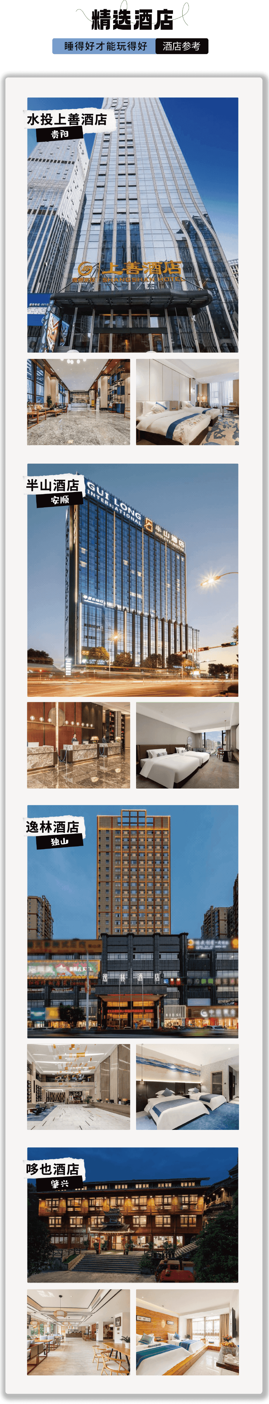 安顺:安顺半山酒店、万绿城铂瑞兹酒店、安顺华通大酒店或其他同级酒店